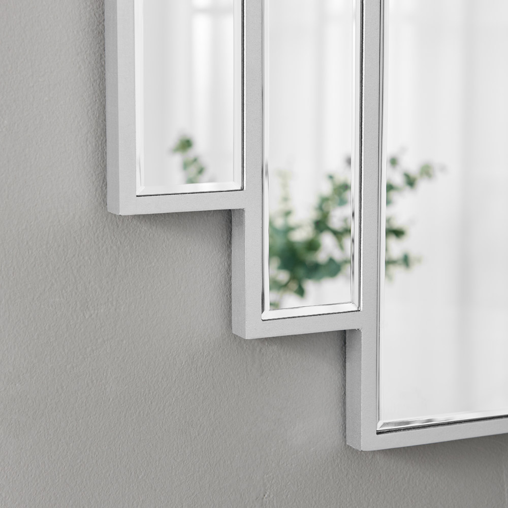 Introduce a touch of 1920s glamour to your home with this Furniturebox Jazz wall mirror. Inspired by 1920s Art Jazz Gatsby, the semi-matte silver metal frame offers a striking focal point for any room. Its layered design and symmetrical form blur the lines between functional mirror and captivating wall art. This mirror is perfectly sized at 66 x 58cm to enhance your space, reflecting ample light without overpowering your decor. A superb addition to any stylish home, this small wall mirror is framed in silver. Please note: Not suitable for bathroom use.