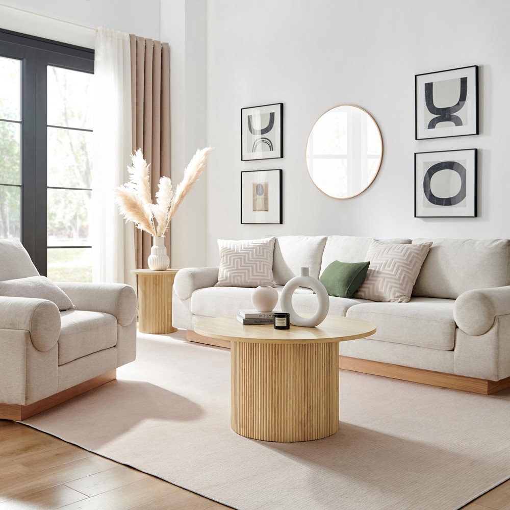 Introduce a touch of minimalist elegance to your living space with the Penrose oak effect round wooden pedestal coffee table. Boasting a round table top with an oak effect finish and a clean, single slatted wood pillar leg, its design takes cues from both Scandi and Japanese aesthetics. This simple yet elegant end table provides ample space for your tea and other living room essentials. Crafted from sturdy and durable wood composite, it features a scratch-resistant matte melamine veneer with authentic wood grain details. The Penrose coffee table's sleek and minimalist design makes it a fabulous addition to any modern home. Matching side and dining tables are also available in both oak and black finishes. Furthermore, this product is FSCA certified, ensuring the wood is sustainably sourced.