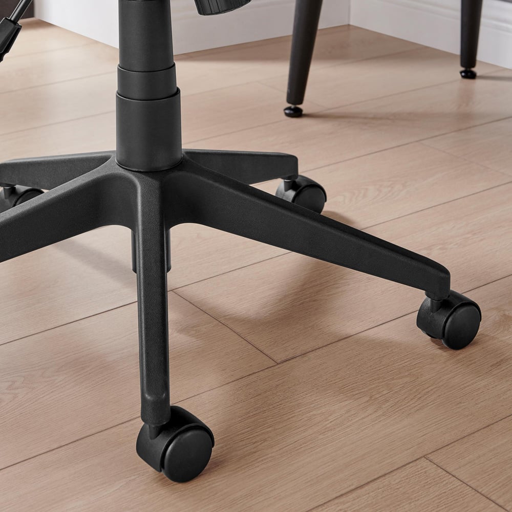 The Rosco sits upon sturdy black plastic legs, complete with five castor wheels for smooth mobility. It's upholstered in soft-touch black faux leather, layered over durable foam and a coil-sprung seat – similar to the luxurious fillings found in mattresses. Height adjustability, combined with a butterfly tilt and swivel mechanism in the seat plate, allows for optimal positioning. Also available in brown faux leather.