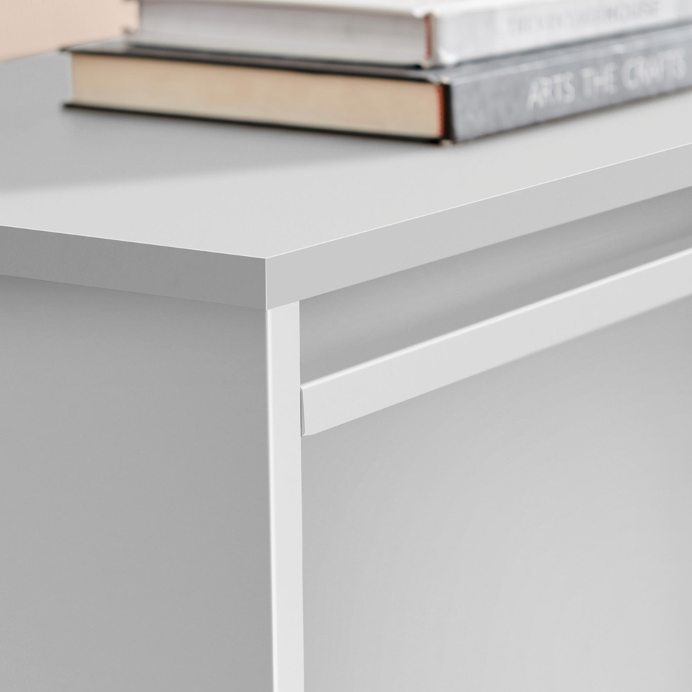 The Svit small sideboard in off-white offers excellent storage, fitting seamlessly into living rooms, dining rooms, or bedrooms. Its top provides ample display space, while a drawer and a two-door cupboard, complete with an internal shelf, neatly conceal other items. The sleek, modern, minimalist design evokes Scandi style. Crafted from robust wood composite with a scratch-resistant, off-white melamine veneer (which may appear light grey depending on the lighting), it stands on semi-matte black metal legs. Matching items are available for bedrooms and living rooms – explore the coordinating Svit range to complete the look. Only minimal assembly is needed – simply attach the handles and legs, so it's quick to set up.
