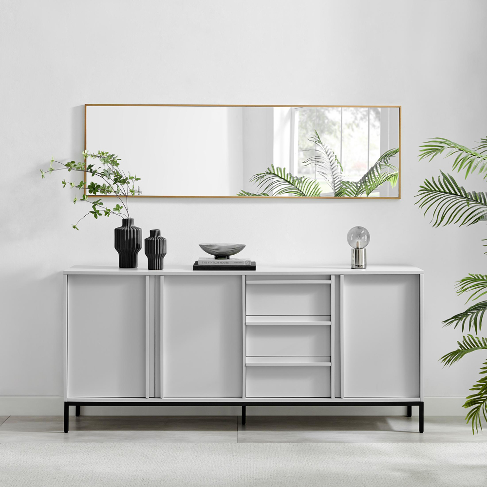This Svit off-white sideboard offers superb storage and a stylish presence in any living room, dining room, or bedroom. The broad top surface provides ample display space, while three separate cupboards – each equipped with an internal shelf – and three drawers ensure everything remains neatly organised. The sleek, modern, minimalist design evokes Scandi-inspired aesthetics. Constructed from robust wood composite with a scratch-resistant off-white melamine veneer (which may appear light grey in certain lighting conditions), it stands on semi-matte black metal legs. Complete the look with matching items available from the Svit range for bedrooms and living rooms. Minimal assembly is required, involving only the attachment of handles and legs, ensuring a straightforward setup.