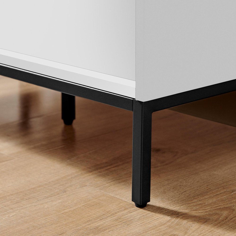 Introducing the Svit four-drawer chest, a stylish storage solution for your bedroom or any space in need of a touch of on-trend Scandi-inspired minimalism. This sleek design boasts a spacious flat surface, perfect for displaying your favourite accessories, and four drawers to keep your essentials neatly organised. The off-white surfaces, which can appear light grey in certain lights, provide a subtle contrast to the semi-matte black, powder-coated metal legs, enhancing its minimalist appeal. Constructed from durable wood composite with an off-white melamine veneer, this chest of drawers is also available in an oak-effect veneer. Coordinate your space with other matching bedroom and living room furniture from the Svit range. Minimal assembly is required, attaching only the legs, ensuring a quick and easy setup.