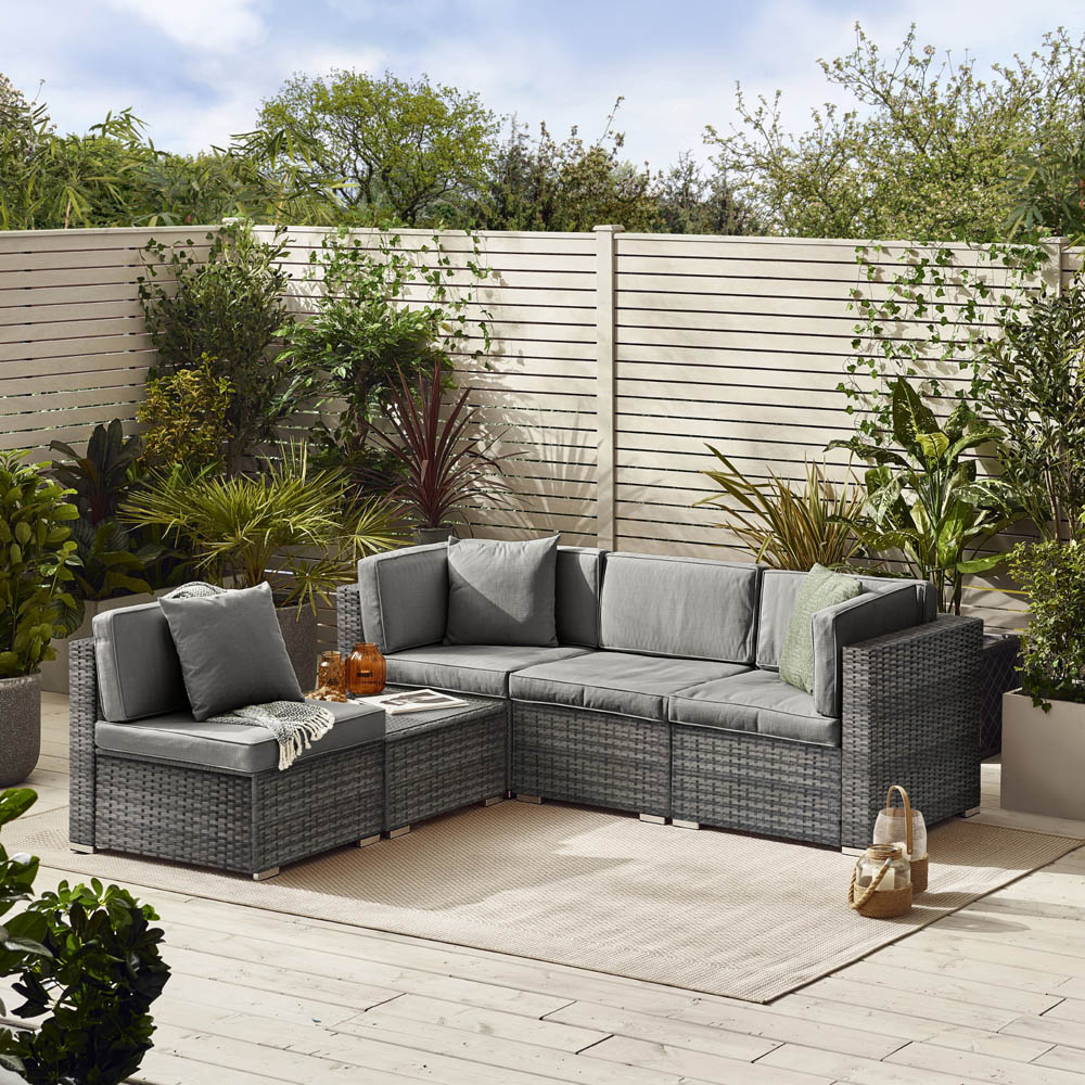 Relax and enjoy the outdoors with the Furniturebox Windermere 4 Seater Grey Rattan Sofa Lounge Set. This stylish outdoor sofa is perfect for gardens of all sizes, featuring a textured PE resin rattan frame that's designed for year-round outdoor use. Its modular design lets you create the perfect configuration for your space. The durable, lightweight metal inner frame adds strength and weather resistance. The thick, 10cm foam-filled cushions provide exceptional comfort and support, while their splash-resistant fabric makes spills easy to manage. Included clips keep the pieces securely together, allowing for flexible arrangements to suit your needs, whether you're sunbathing or entertaining guests. A matching coffee table with a tempered glass top offers ample space for drinks and snacks. A water-resistant cover is included for protection (note: not fully waterproof, store cushions indoors during wet weather and winter). Simple assembly is required, with detailed instructions provided.