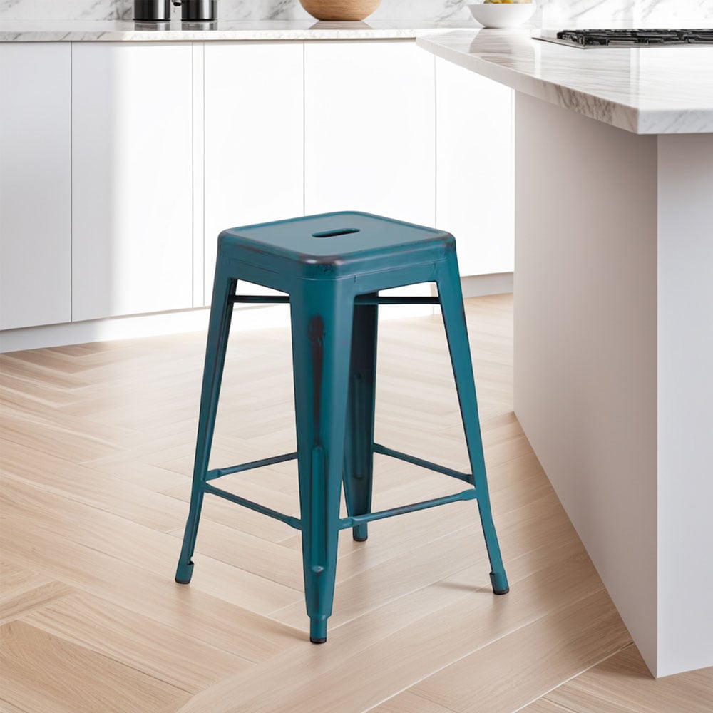 Bring a touch of rustic charm to your kitchen or garden with this set of four fully assembled 24" distressed steel bar stools. Finished in a distinctive blue teal with a distressed, weathered effect, these stools arrive ready to use, saving you precious time and effort. Crafted from galvanised steel, they offer exceptional durability, making them equally suited for indoor gatherings or relaxed outdoor living. Designed for both style and convenience, these bar stools provide comfortable and convenient seating at your counter or bar, effortlessly enhancing your space and making everyday moments that little bit easier.
