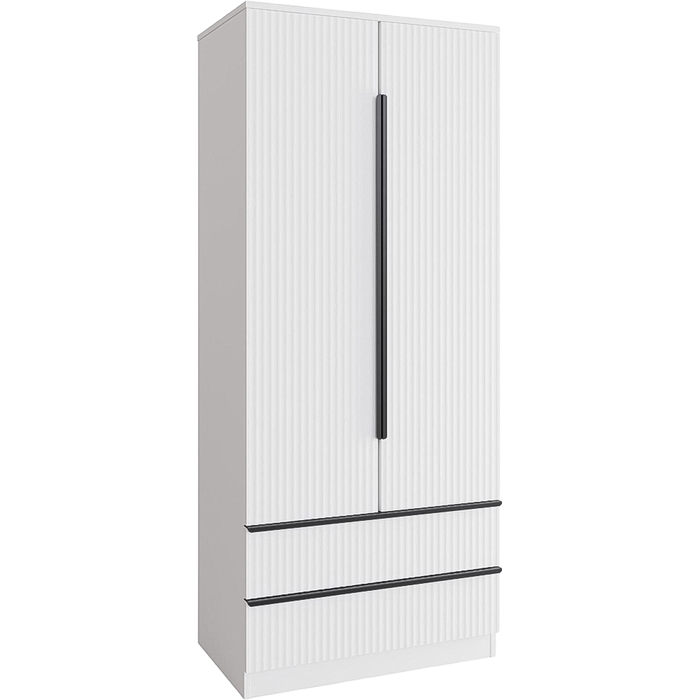 Featuring two doors with a unique ripple effect, and two drawers for smaller items, this wardrobe is as practical as it is attractive. Strong black metal handles provide easy access, while the scratch and UV-resistant coating ensures lasting durability.
