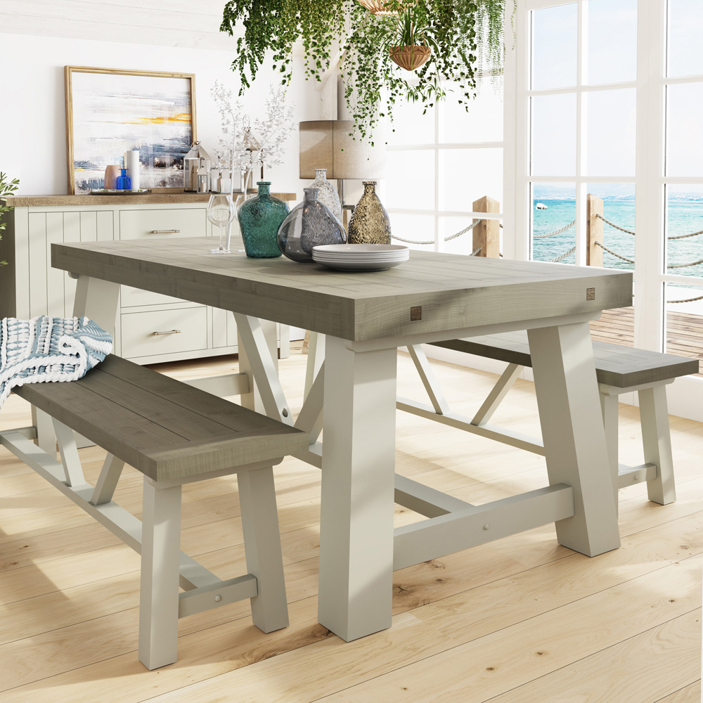 This 2m solid reclaimed pine dining table will transform your dining room. Its rustic charm comes from reclaimed pine, an eco-friendly choice showcasing unique grain patterns and characterful knots. The two-tone design—a driftwood top and truffle base—adds to its captivating beauty. Meticulously handcrafted, this table comfortably seats eight or more, perfect for gatherings. Enjoy its versatility with extendable leaves (sold separately.