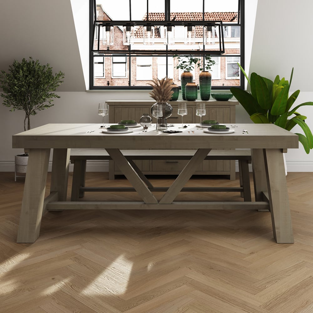 The 2m fixed top dining table in natural reclaimed pine is a beautiful and sustainable choice for your dining room. Its rustic charm comes from the unique character of the reclaimed pine, each table is one-of-a-kind, showcasing the natural imperfections that give aged wood its distinctive appeal. The lacquered top and underside offer excellent protection, ensuring this piece will remain a focal point in your home for years to come. The sturdy, fixed top provides ample space for family meals and gatherings, creating a welcoming atmosphere for memorable moments.