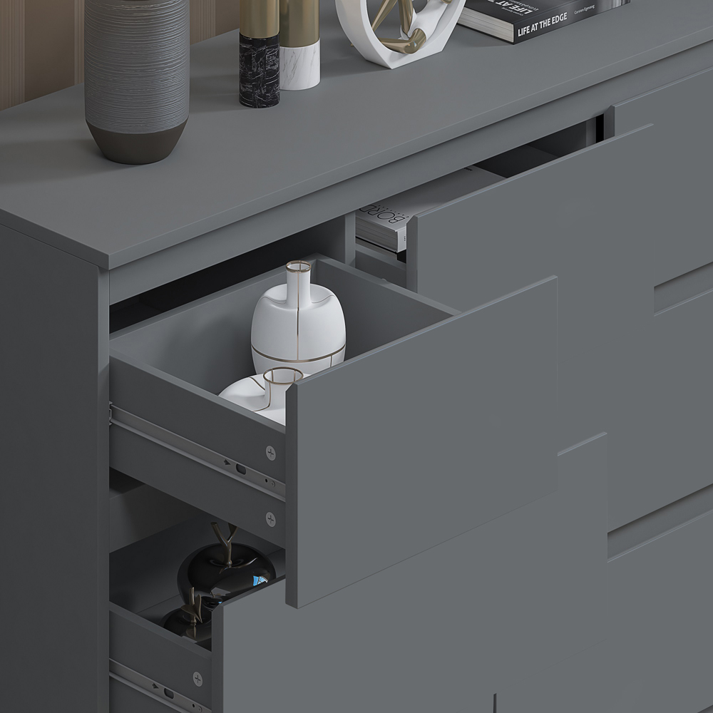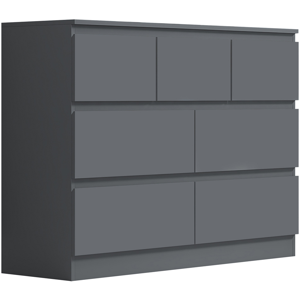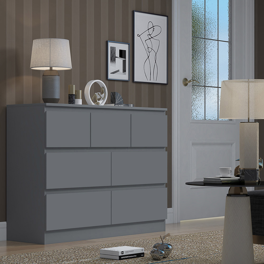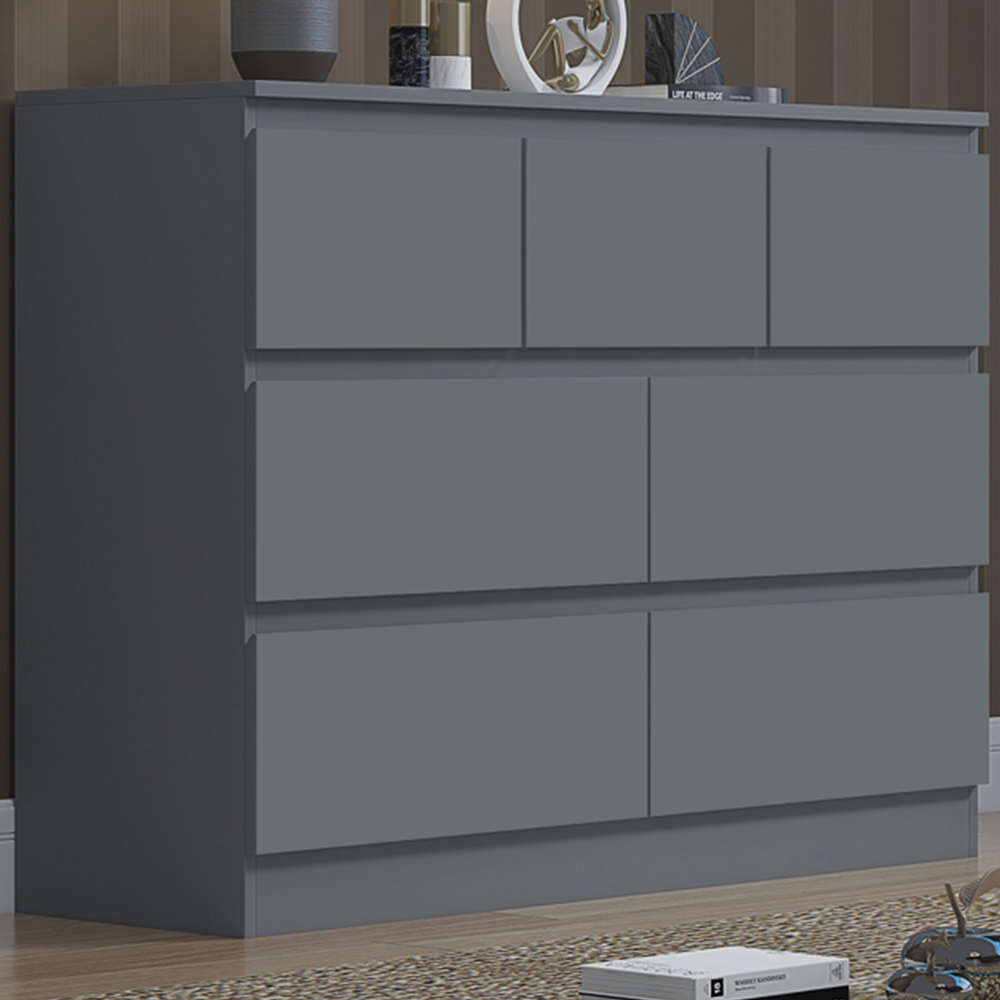 A sophisticated storage solution for the modern bedroom, this seven-drawer chest boasts a sleek matt dark grey finish. Its design cleverly incorporates four generous lower drawers and three smaller top drawers, offering ample space for organised storage of items both large and small. Each drawer provides a substantial 14cm of internal depth. The scratch-resistant surface ensures lasting quality and style, adding a touch of understated elegance to any room.