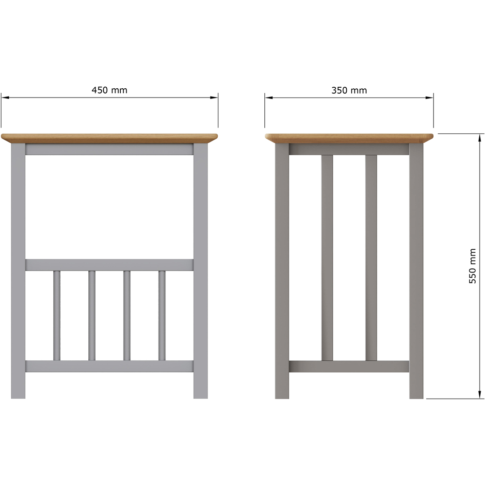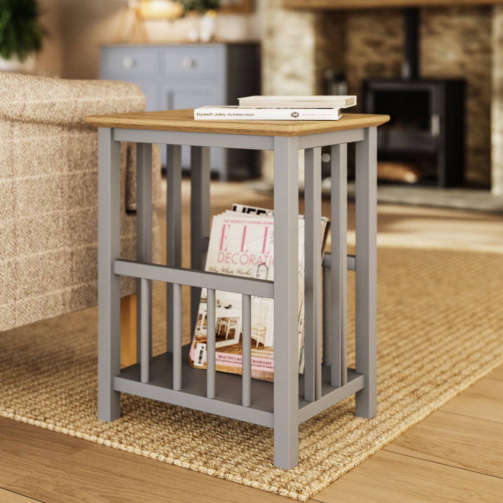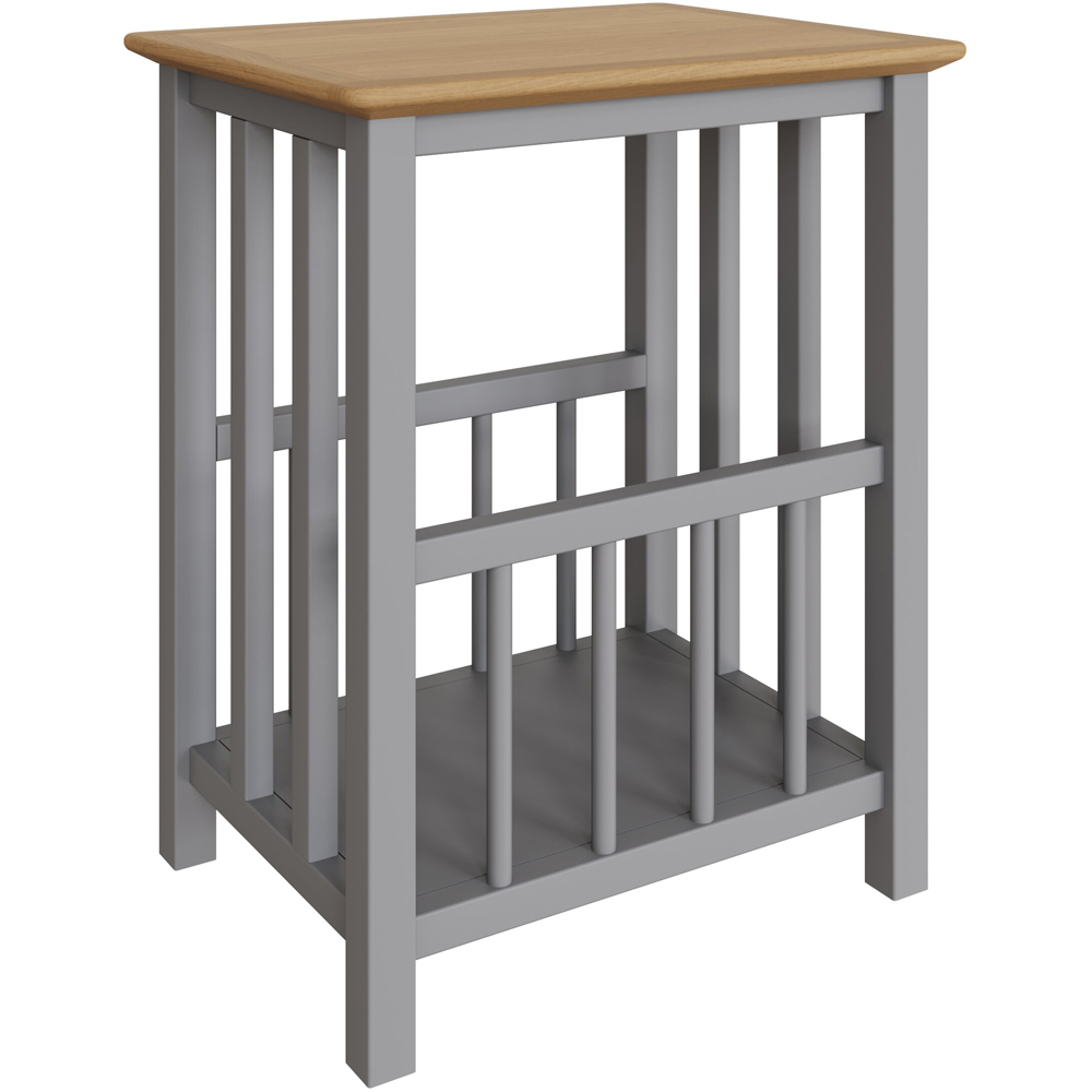 The Taberno Oak Magazine Rack: a stylish Dove Grey addition to any room, keeping your newspapers and magazines neatly organized and readily accessible. Crafted from high-quality materials, its light oak veneered top adds a touch of warmth and natural beauty.