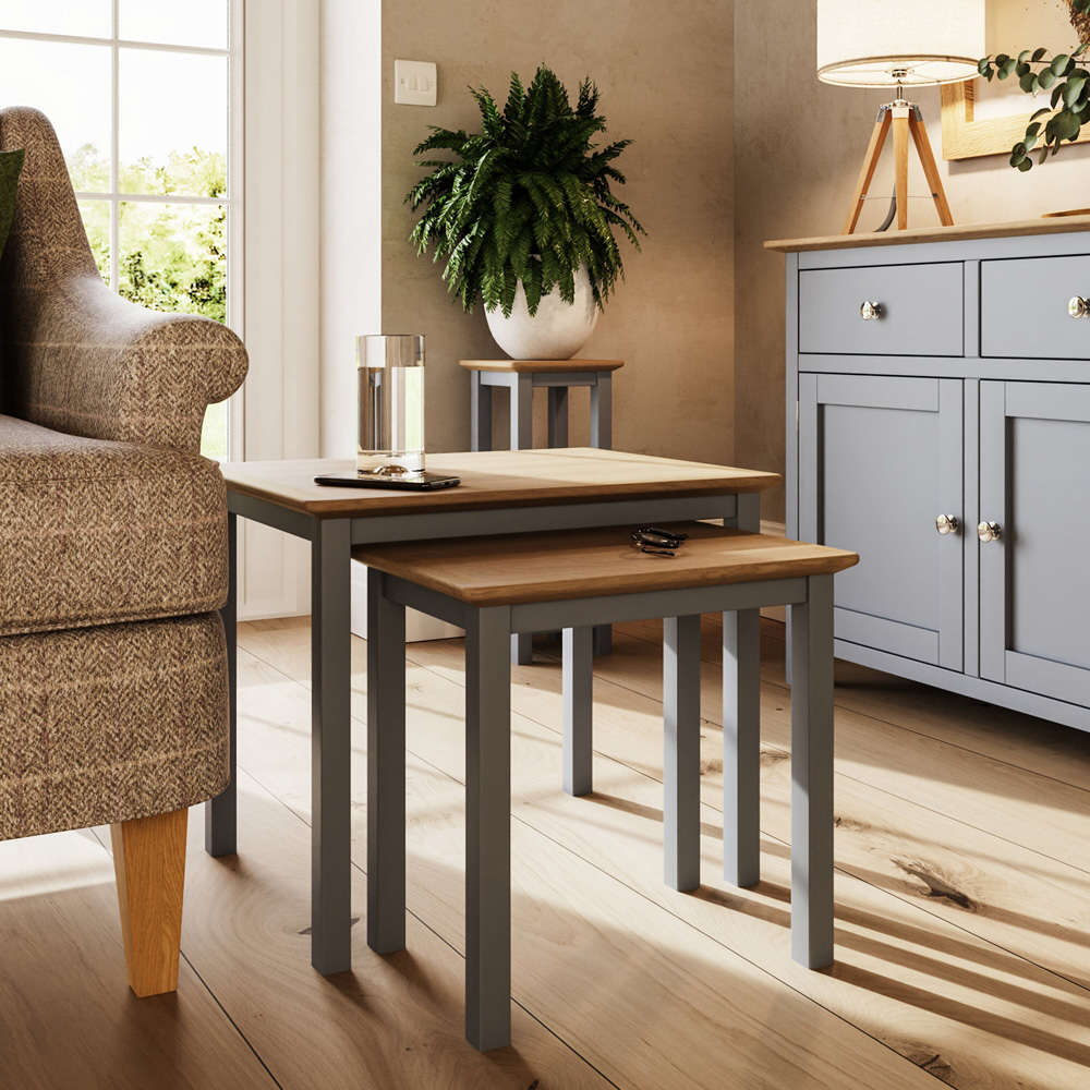 The Taberno Oak Nest of Tables: a stunning Dove Grey addition to your home. Crafted from high-quality materials, these two tables feature a light oak veneered top for a touch of warmth and natural beauty. With nested dimensions of 55cm wide, 44cm deep, and 45cm high, they're perfectly sized for smaller rooms while still offering ample surface space for drinks, snacks, and more.