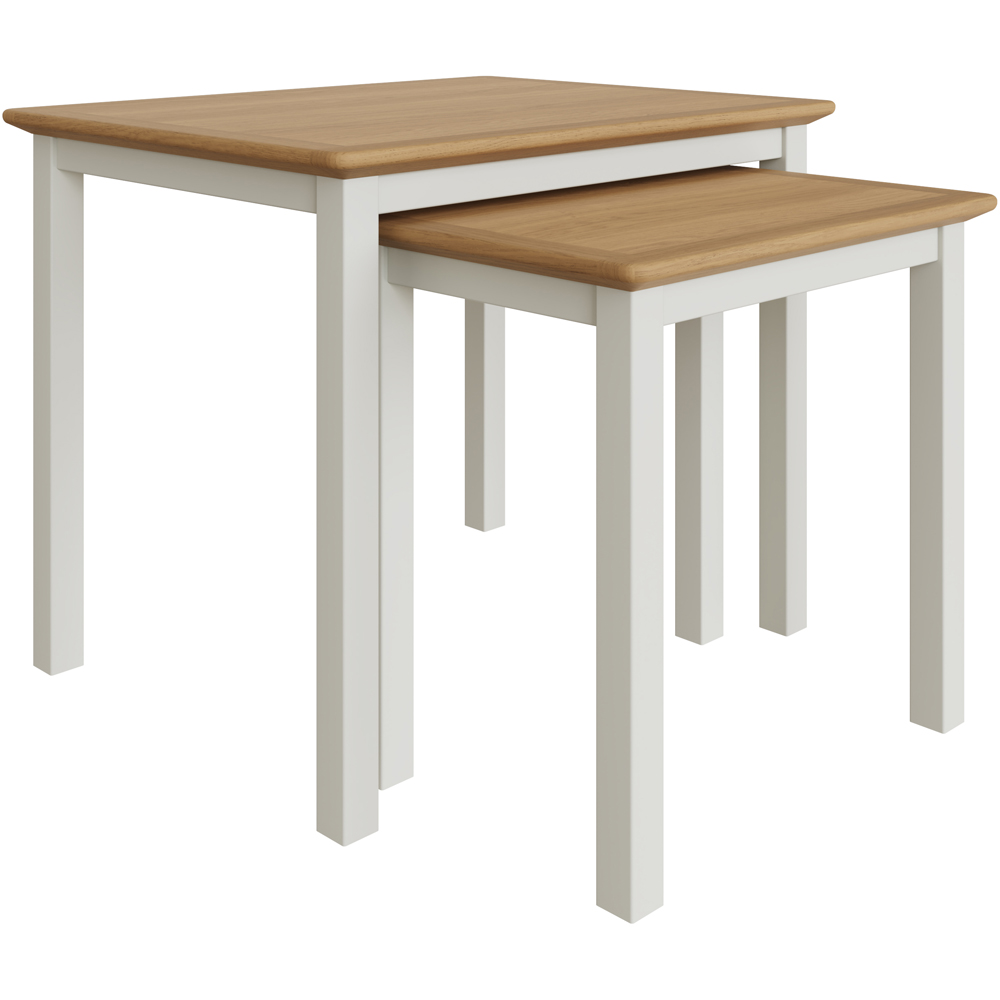 Elevate your living space with the Taberno Oak Nest of Tables. This stylish two-piece set boasts a sophisticated White Linen finish, complemented by a warm light oak veneer top. Perfectly sized for any room, the nested tables measure 55cm wide, 44cm deep, and 45cm high, offering ample surface area for drinks, snacks, and more. Their compact design makes them ideal for smaller spaces, while still providing the practicality of two separate tables. A truly versatile and attractive addition to your home.