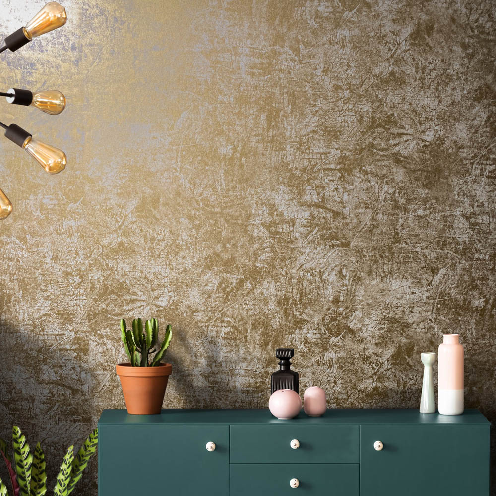 Transform your home with the Industrial Effects Metallic Gold and Grey Wallpaper. This stunning wallpaper brings an industrial, weathered vibe to any room, creating a bold and beautiful backdrop that commands attention. The metallic finish adds a touch of glamour, reflecting light beautifully to enhance your space. Perfect for adding a stylish touch to your modern home, this wallpaper is easily installed with a simple paste-the-wall application. Its dry strippable design ensures stress-free removal, while the high-quality washable finish makes cleaning easy.