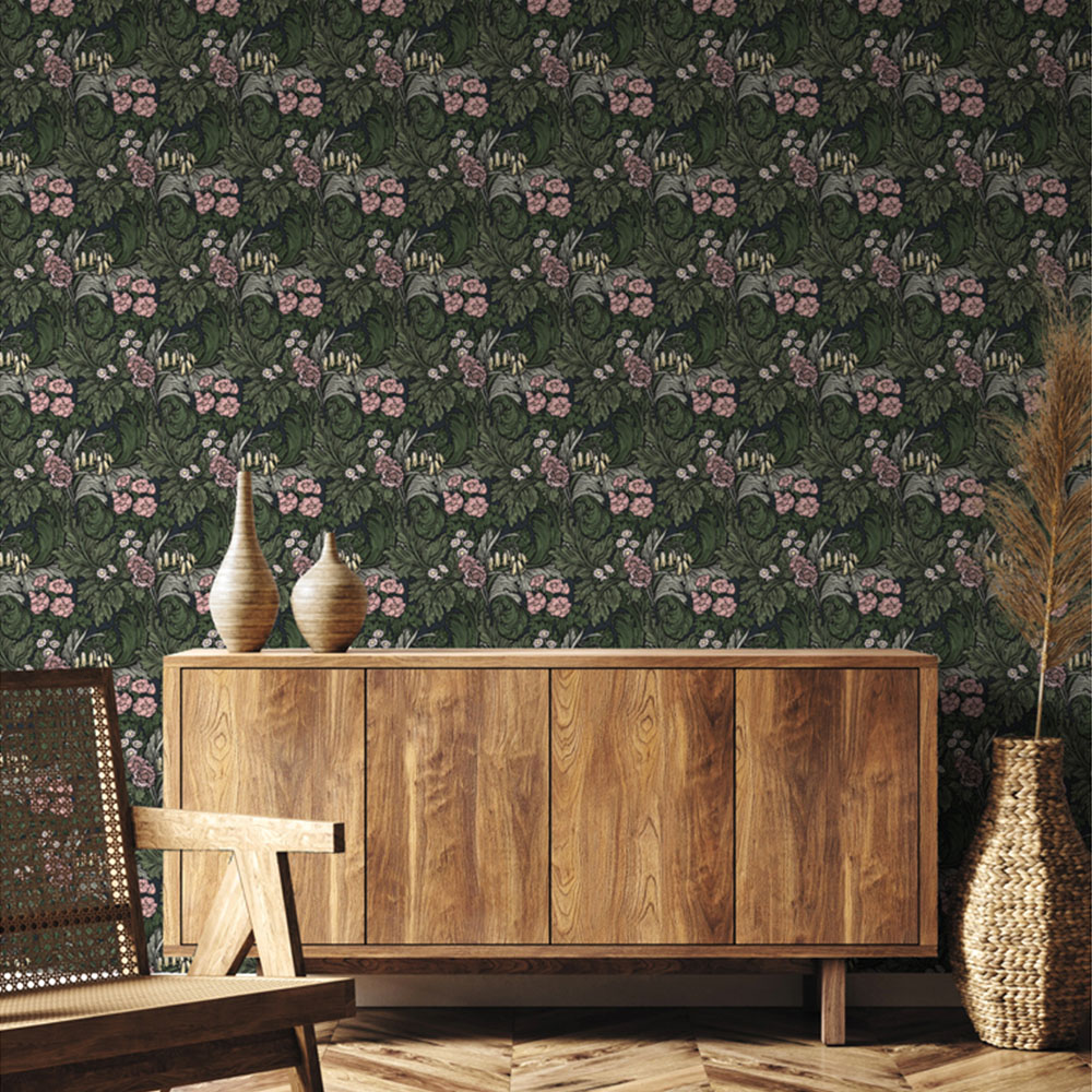 Transform your interior space with this stunning Galerie Llewelyn-Bowen Off The Wall Floral Pink Wallpaper. Inspired by 19th-century gardens, it uses nature with architectural panache, celebrating shrubs for their muscular photosynthesis. This design creates exterior spaces with a fairytale mystery, making rooms feel larger by blurring interior boundaries with its large-scale organic patterns. Perfect for adding a touch of enchantment and elegance to any room, this wallpaper brings the beauty of nature indoors in a vibrant and captivating way.