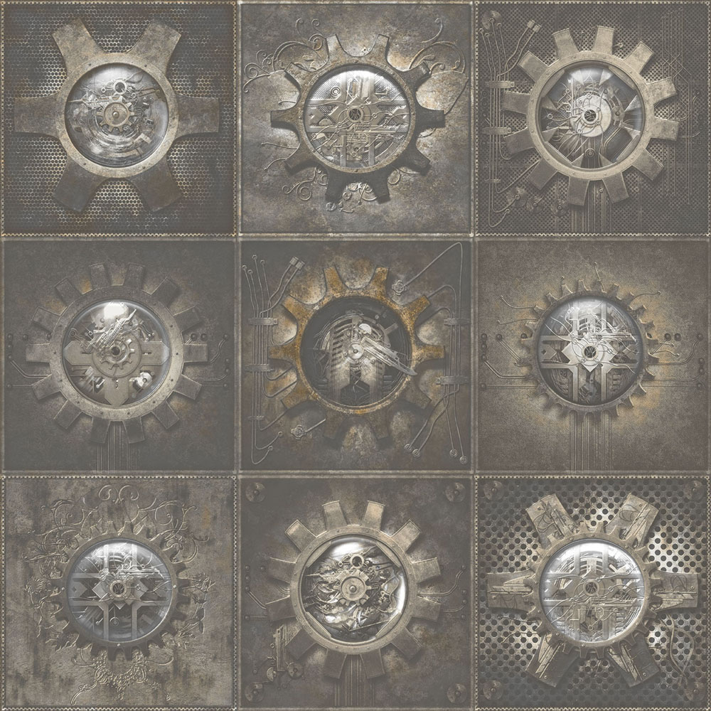 Elevate your interior with the Nostalgie Industrial Tile Bronze Wallpaper. This striking design showcases a medley of metallic medallions, each boasting intricate industrial-style detailing in rich browns, accented by subtle beige tones and shimmering metallic highlights. The wallpaper's intricate tile pattern creates a stunning, artistic focal point for any wall. Perfect for adding a shimmering beauty, it's easily applied with paste-the-wall technology, and is washable and strippable.