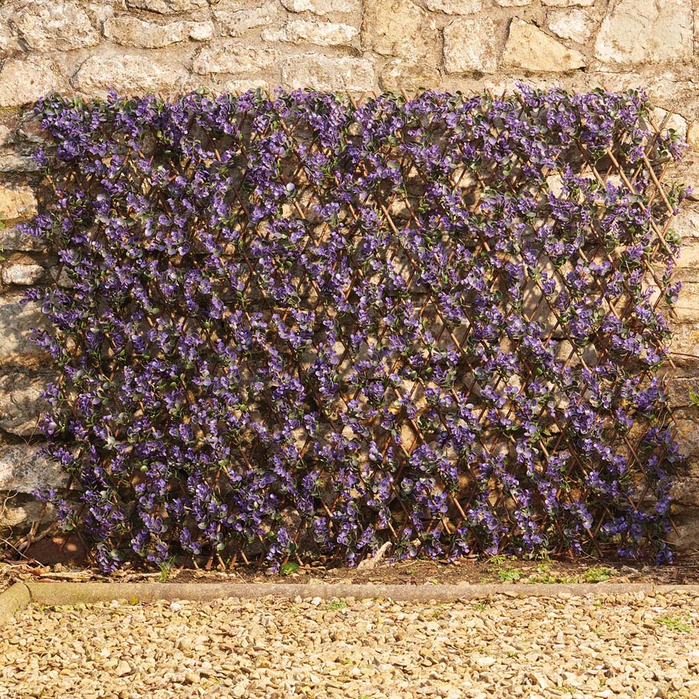 Transform your outdoor space with this artificial hedge trellis. Ideal for concealing unattractive walls and fences, it instantly injects vibrant life into gardens and courtyards without the upkeep of real plants. Crafted from a blend of polyethylene and willow, this durable trellis is built to withstand even the harshest weather, maintaining its beauty for years to come. Enjoy the convenience of no watering or pruning, and consistent colour throughout the year. Its low-maintenance nature allows placement anywhere, regardless of sunlight exposure. Featuring colourful purple flowers and green leaves, backed by 100% natural willow, it offers a realistic and long-lasting solution. Perfect for covering walls, hedges, arbours, or pergolas, creating inviting shaded areas. Easy to install and completely maintenance-free, this weather-resistant trellis (50% PE, 50% willow) is a must-have for any garden.