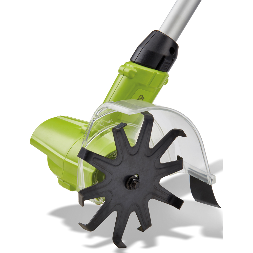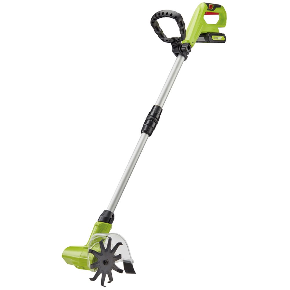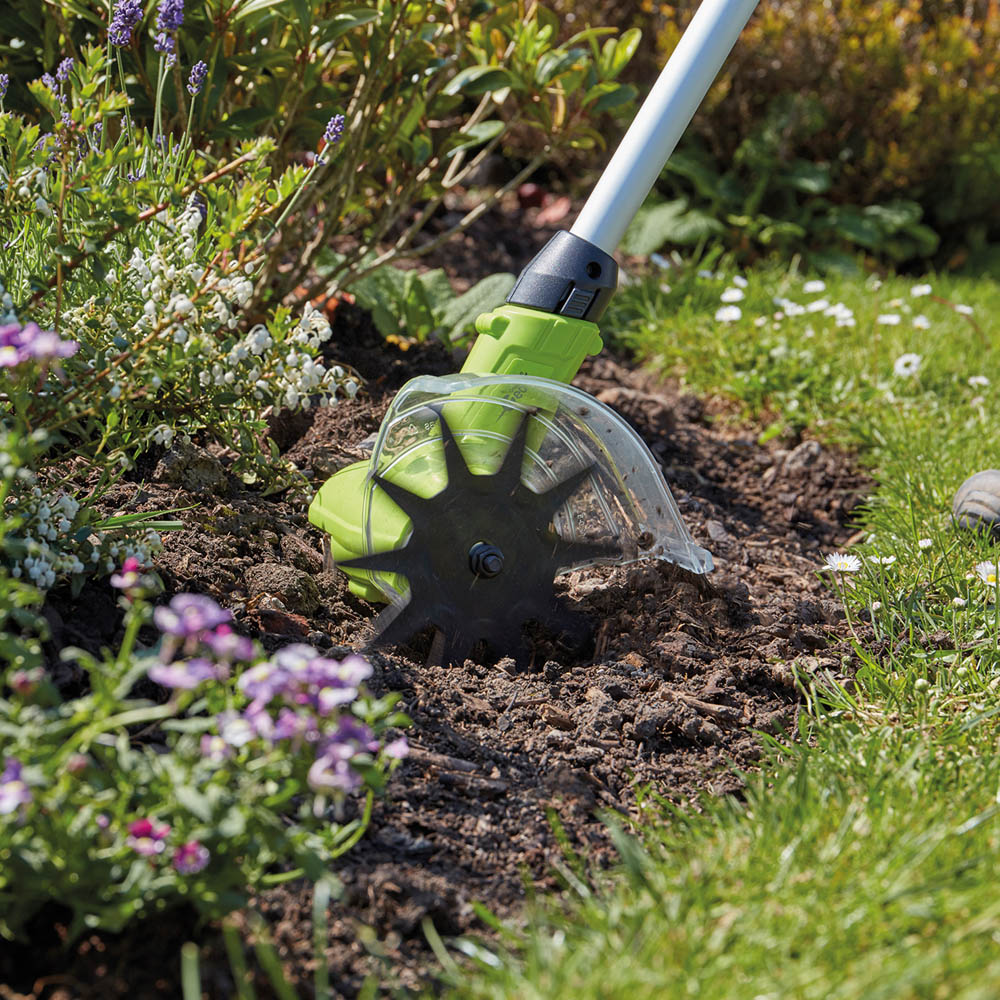 Effortlessly prepare your soil for planting with this powerful cordless cultivator. Ideal for digging, levelling, weeding, incorporating fertiliser, and creating sowing furrows, this versatile tool simplifies garden tasks. Its ergonomic design incorporates two comfortable grip handles for precise control and effortless manoeuvrability, preventing damage to surrounding areas. The robust motor effortlessly powers the sturdy blade through even the toughest soil, creating optimal conditions for healthy plant growth. Whether levelling, preparing new planting areas, or simply breaking up soil, this cultivator tackles various soil types quickly and efficiently. Achieve a cutting depth of up to 7cm, multiple passes create finer soil granules. This cordless model includes battery and charger. Specifications: Cultivator dimensions: L94.5-124 x W20 x H34cm, Weight: 2.16kg, Blade: Diameter 155 x H2.7mm, Blade weight: 0.7kg.