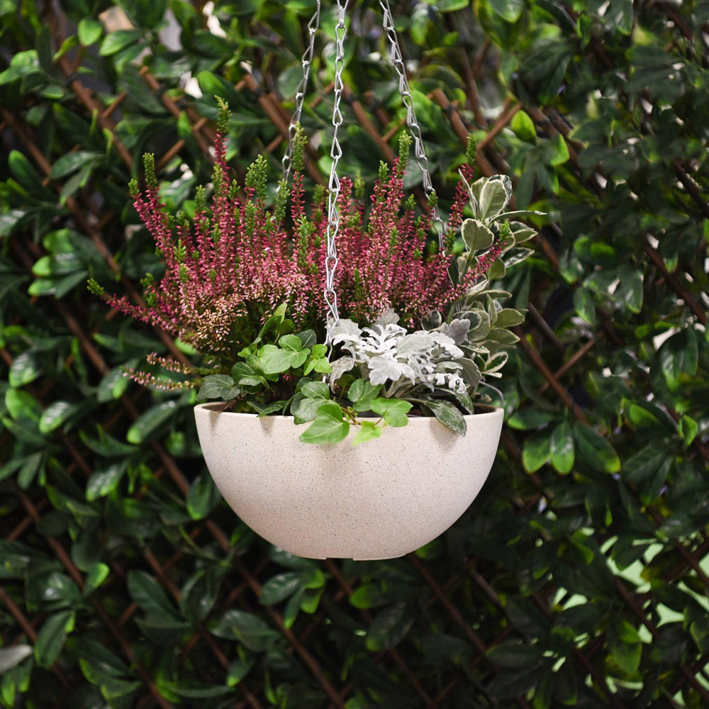 This stylish hanging basket adds instant elegance to any garden. Showcase vibrant flowers, trailing plants, herbs, or even tomatoes in this durable, stone-effect planter. Its subtle design complements any outdoor space, and its lightweight yet strong construction (70% recycled polypropylene, 30% stone powder) ensures it withstands the elements. UV and frost-resistant for lasting beauty, this eco-friendly basket is easily moved to refresh your garden's look. Choose from a lily white or marble effect finish. The basket includes a 50cm three-way metal chain for easy hanging. Dimensions: Diameter 25cm, Height 13cm, Bottom Diameter 10cm; Thickness 6mm; Weight 0.5kg.