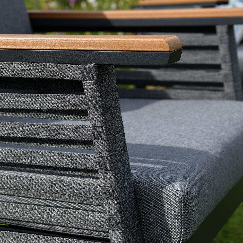 Create a stylish and comfortable outdoor haven with this four-seater aluminium garden furniture set. Crafted from high-quality, powder-coated aluminium in a dark anthracite grey, this set offers durability, a lightweight design, and superior weather resistance. Relaxe in comfort with the generously padded 10cm thick seat and back cushions. The set includes a two-seater sofa, two armchairs, and a coffee table, perfect for enjoying al fresco dining or simply unwinding. The coffee table measures 100 x 55.5 x 43cm, the sofa 78 x 130 x 80cm, and each armchair 78 x 70 x 80cm. Simple assembly is required. For optimal longevity, store the set under cover during periods of extreme weather.