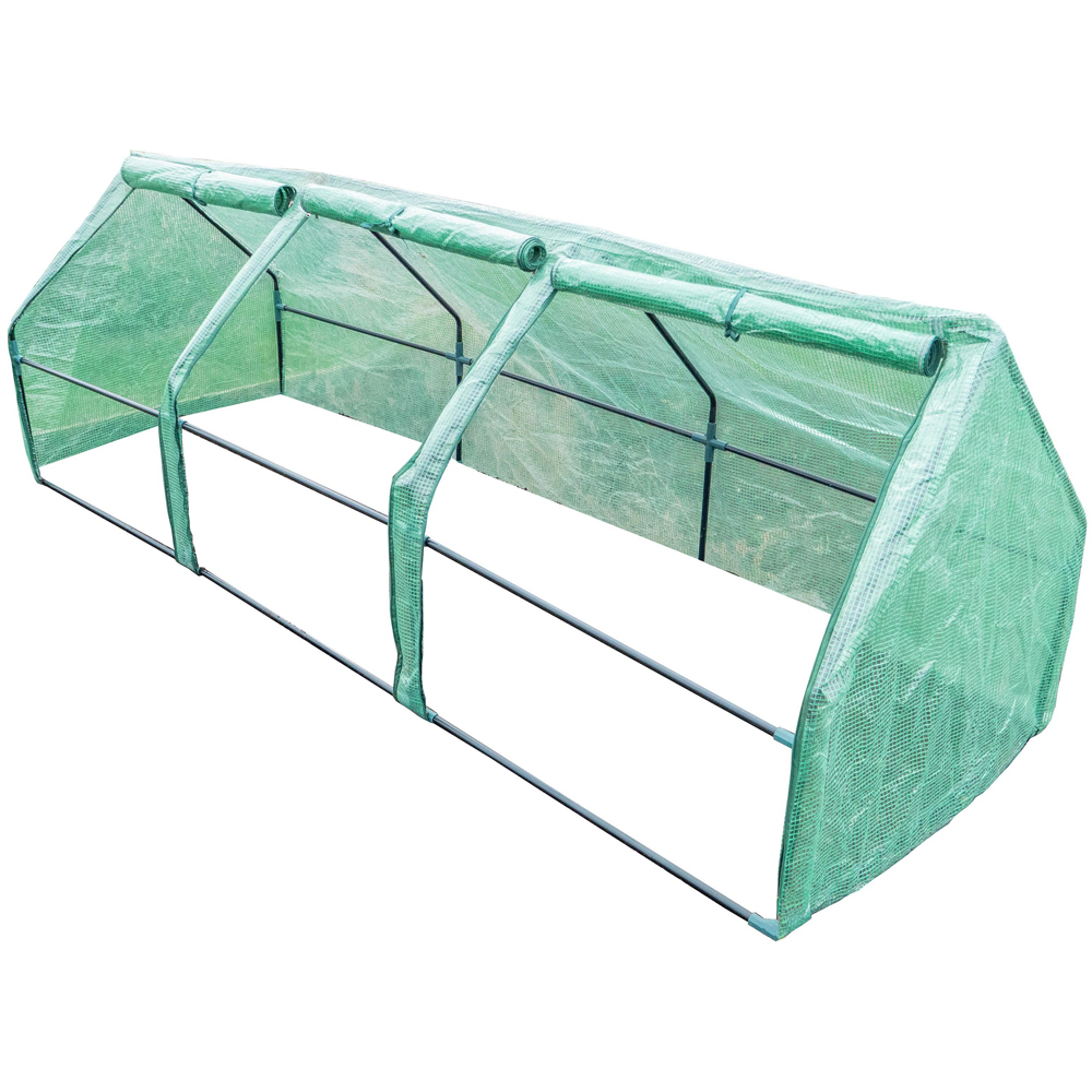 Protect your precious plants from the elements with this Garden Grow cloche. Ideal for shielding seedlings, vegetables, or flowerbeds from harsh weather, particularly cold and wet conditions, this cloche offers robust protection. Easily lift and relocate vulnerable plants for frost protection during winter, or simply unpeg and move it as needed. Featuring double-stitched seams for exceptional durability, it boasts two zipped windows that roll up for convenient access and temperature control. These windows are also covered by roll-down PE covers. Supplied with metal pegs for secure ground anchoring, this cloche ensures young plants thrive even in challenging conditions. Its lightweight design allows for simple relocation or convenient storage after use. Dimensions: L270 x W90 x H90cm. Frame: Steel tube. Cover: 130g PE Mesh.
