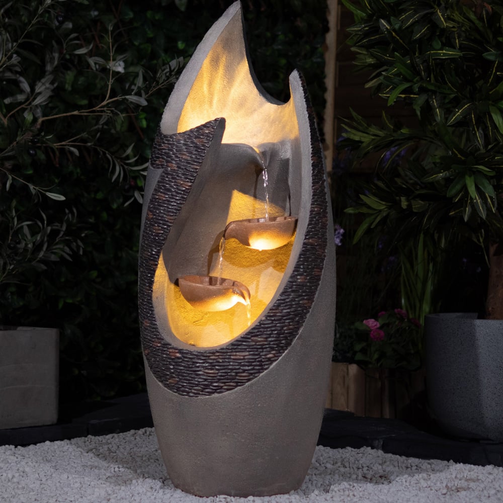 Transform your outdoor space with this stunning water feature. Its contemporary design will effortlessly become a captivating focal point, perfect for creating a tranquil retreat. Watch as water gently cascades down through the tiered bowls, illuminated by warm LED lights for a mesmerising effect. Designed for convenience, this self-contained feature requires no mains water supply, simply fill the basin, and the discreet pump will continuously recycle the water. Crafted from durable, frost-resistant polyresin, this lightweight feature offers lasting beauty. Dimensions: W36 x D33 x H75cm. Weight: 15kg. Power cable: 2m. Mains powered with a 12-month guarantee.