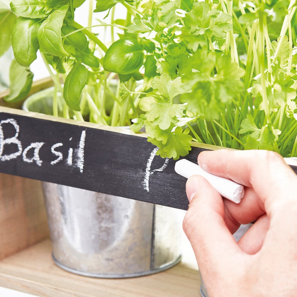 Included are: a stylish wooden planter with chalkboard surface; four peat growing plugs; four zinc pots; four peat growing pots; garden snips; and seed packets of Basil Basilico Genovese, Coriander Coriandrum Sativum, Garlic Chinese Chives, and Parsley (flat leaved) Titan.