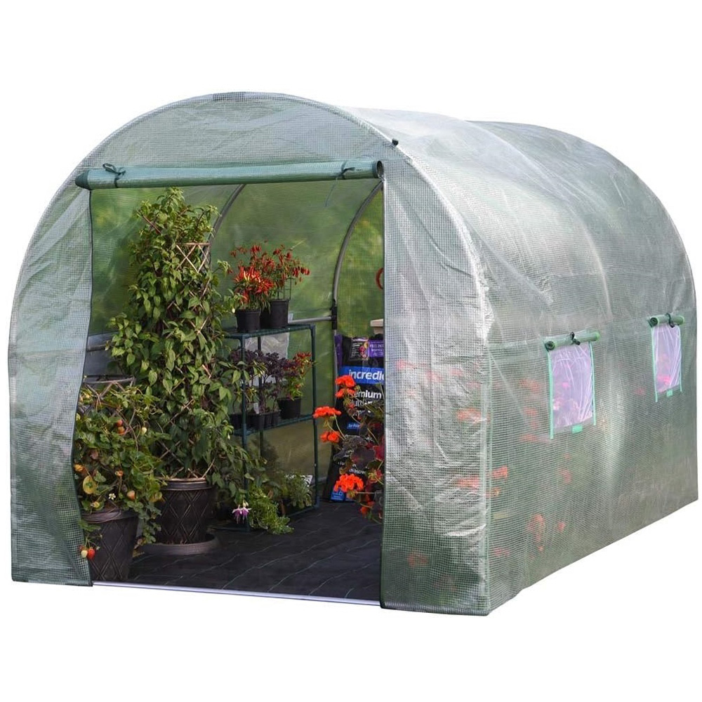 Cultivate a thriving garden with the Garden Gear 3m x 2m Polytunnel. This robust structure, ideal for flowers, plants, and vegetables, boasts a powder-coated steel frame for lasting durability and simple assembly. A waterproof PE cover, reinforced with double-stitched seams, provides reliable protection. Convenient access is ensured by a double zip door, easily rolled up for effortless entry. Netted windows offer precise temperature control, further enhanced by the option to roll down the PE cover for added protection. Securely anchor the polytunnel with the included high-quality metal pegs. Its lightweight design allows for easy relocation or convenient dismantling for storage after the growing season. A perfect solution for safeguarding young plants from harsh weather. Dimensions: L3m x W2m x H1.9m. Steel tube diameter: 24mm. Fabric: 140gsm PE green mesh.