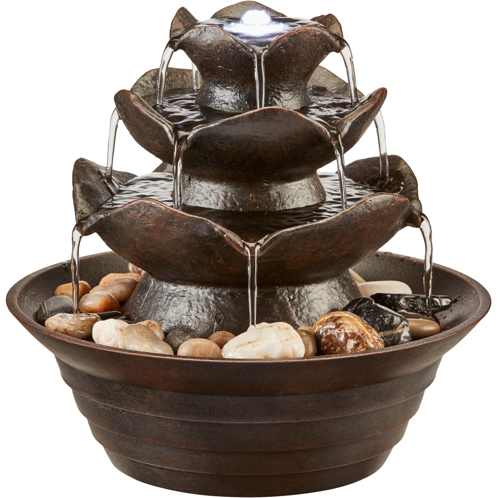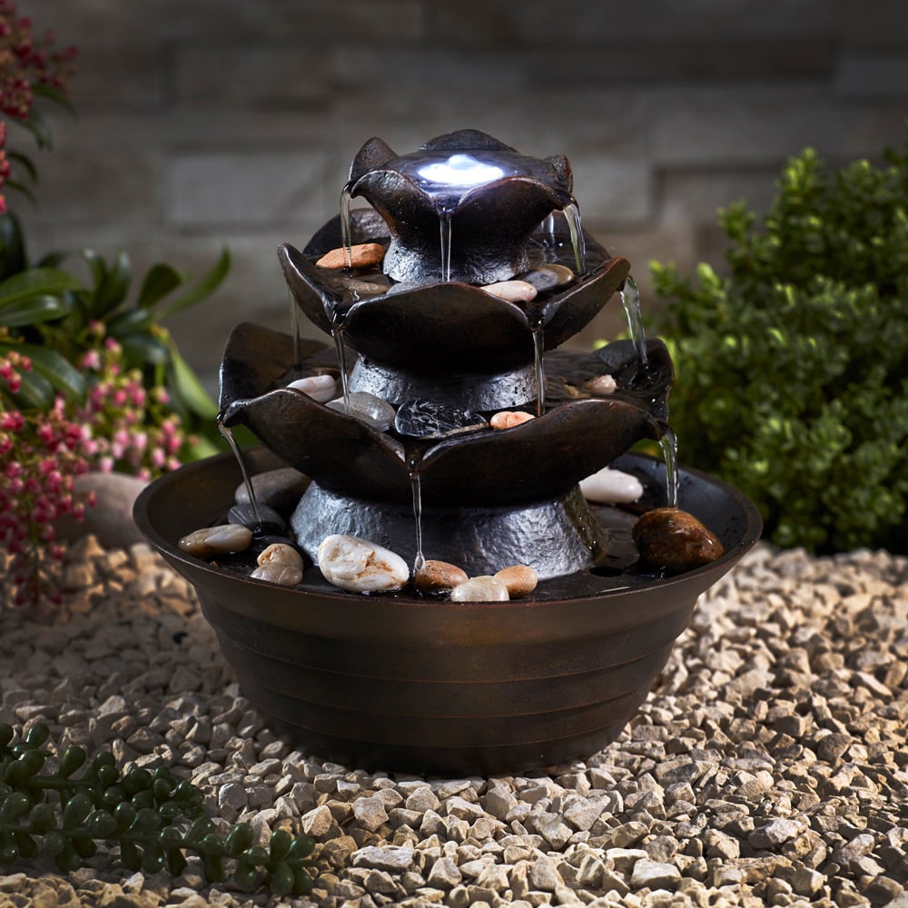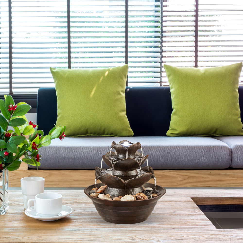 Transform your home with this elegant oriental water feature. This captivating tabletop design creates a tranquil focal point, perfect for relaxation. Watch the water gently cascade down its tiers, adding beauty and serenity to any room. Atop the feature, an LED light casts a stunning illuminated dome effect. Designed for convenience, this self-contained water feature requires no mains connexion. Simply fill the basin, and the discreet pump silently recirculates the water, creating a continuous, mesmerising flow. Crafted from durable, lightweight polyresin, it',s built to withstand the elements, resisting frost damage and cracking.