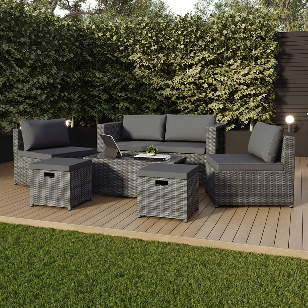 Create your own outdoor haven with the Islay 6 Seater Rattan Garden Lounge Set. Perfect for relaxation and entertaining alike, this contemporary set offers ample seating for family and friends. The generous arrangement includes a comfortable sofa, two armchairs, two stools, and a stylish table with a tempered glass top. Crafted from durable, weather-resistant rattan, this set promises years of enjoyment in any outdoor setting. The plush cushions add a touch of luxury, ensuring ultimate comfort whether you're hosting a gathering or simply unwinding after a long day. Transform your patio, decking, or garden into a sophisticated space with this charming and practical addition to your home.