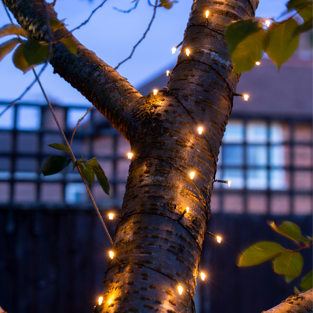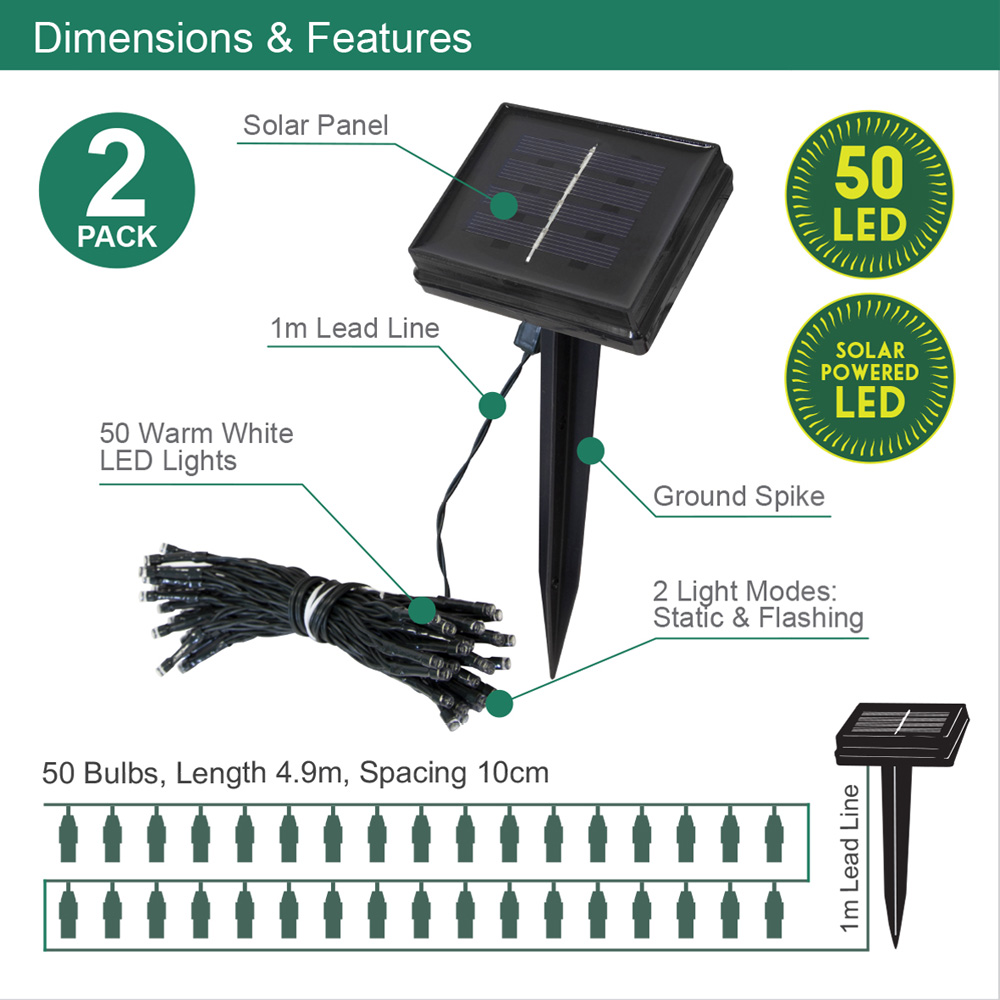 Elevate your outdoor space with the GardenKraft solar string lights. These warm white LED lights, featuring 50 bulbs, instantly add charm to gardens, transforming patios, BBQs, and wedding celebrations into magical settings. Effortlessly illuminate your evenings, the solar panel conveniently charges during the day, automatically activating the lights at dusk and switching off at dawn. Enjoy worry-free illumination, as these IP44 weatherproof lights withstand any weather. With a 4.9m length and two lighting modes—static and flashing—you can customize the ambiance to perfectly suit your mood.