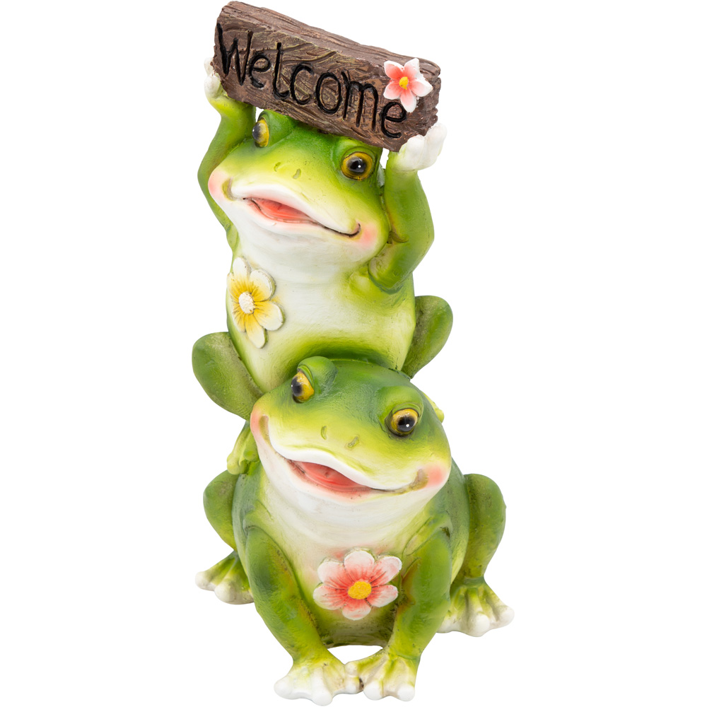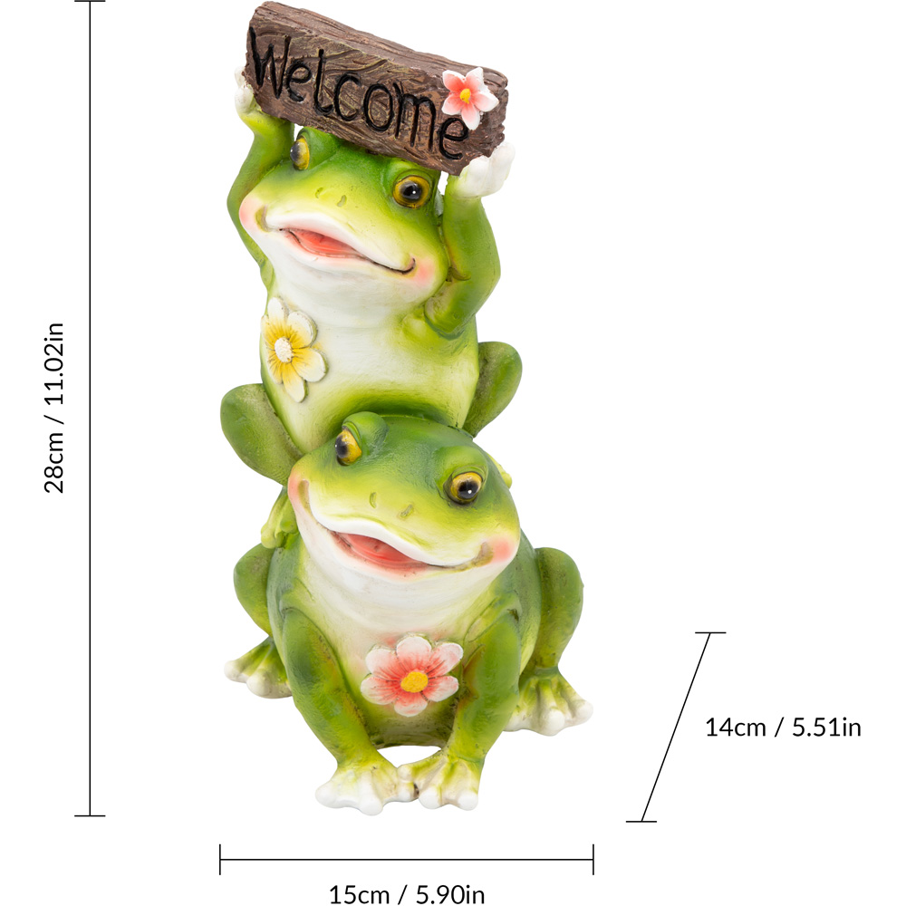 Add whimsical charm to your garden with this delightful Welcome Sign Ornament. Two intricately sculpted frogs, one playfully carrying the other, extend a warm greeting to all visitors, the frog being carried holds a "Welcome" sign. The vibrant green frogs, complete with rosy red cheeks and colourful floral accents, are crafted from durable, lightweight, and weather-resistant polyresin. A perfect blend of artistry and practicality, this charming sculpture will bring joy to both children and adults.