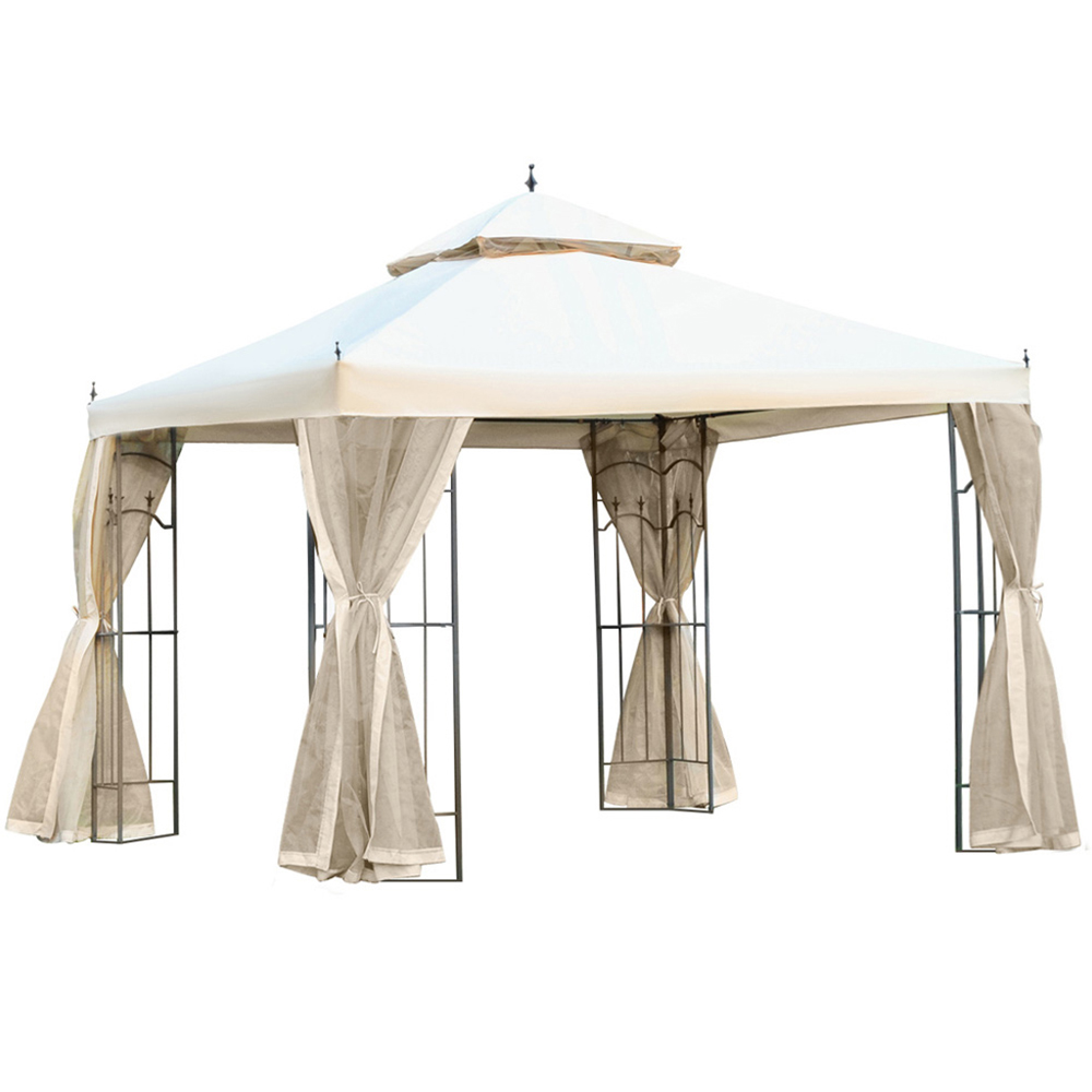 Make a statement in your garden and outdoors with this Outsunny 3 x 3m White Double Top Gazebo with Cream Mesh Curtains. With elegant metal rails placed on each corner, attached curtains and mosquito nets, this unit is perfect to create privacy and keep bugs out. Featuring a two-tier top on the roof, it allows air to flow in and out efficiently. Made using powder-coated steel, the unit offers extra strength and is sturdy enough to stay in place all day long. Also, it is finished with built-in rain grommets, so liquids fall straight to the ground. Easy to fit, it comes with eight ground stakes to offer a firm placement. Apart from this, the gazebo with sides comes complete with four curtains with hooks and loop straps. Size: 3 x 3m.