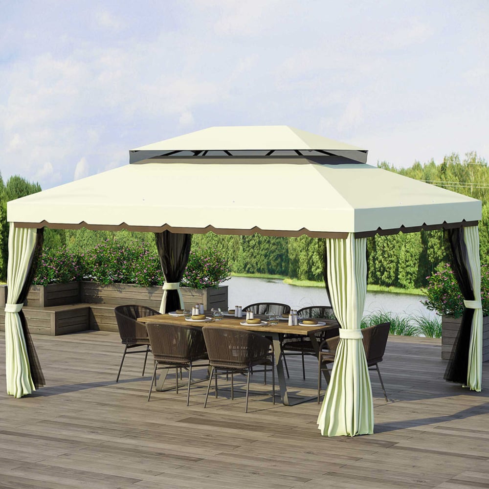 Add life to your outdoors with this Outsunny 4 x 3m Cream Canopy Marquee Pavilion Patio Gazebo Tent with Sides. This stunning tent will provide your family and your friends with comfort. With 160g of water-resistant polyester and a durable, rust-resistant, power-coated aluminium alloy frame, this garden pavilion ensures years of use. Easy to fix, it comes with eight ground stakes for securing your frame to the ground, and the top includes eight built-in drainage holes that prevent water from pooling at the top. Apart from this, the curtained patio tent is perfect to provide privacy while outdoors and preventing insects from entering inside. Size: 4 x 3m.