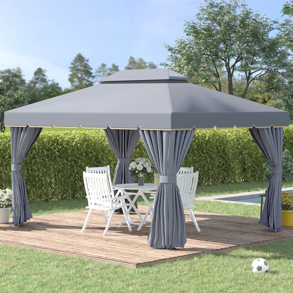 Make outdoor gatherings memorable and comfortable with this Outsunny 4 x 3m Grey Marquee Pavilion Patio Gazebo Tent with Sides. With a generous size, this patio tent with curtains makes a perfect room for many individuals and allows you to create an open or private space whenever needed. Featuring a two-tier canopy, this gazebo has a PA-coated fabric that protects you from direct sunlight and light showers. In addition, the curtains come with mesh to help protect you from annoying insects. Easy to fix, the gazebo includes eight ground stakes for extra stability and reliable fitting. Breathable and ventilated, the top vent helps to regulate airflow and create the perfect setting for garden parties. Come do your summer parties the right way this season with this garden pavilion. Size: 4 x 3m.