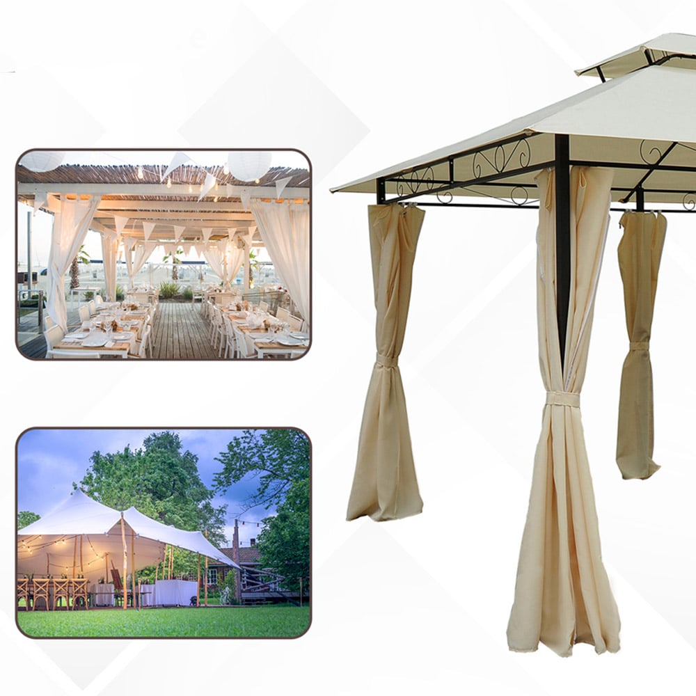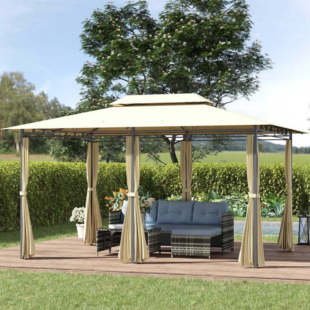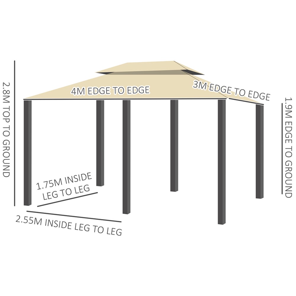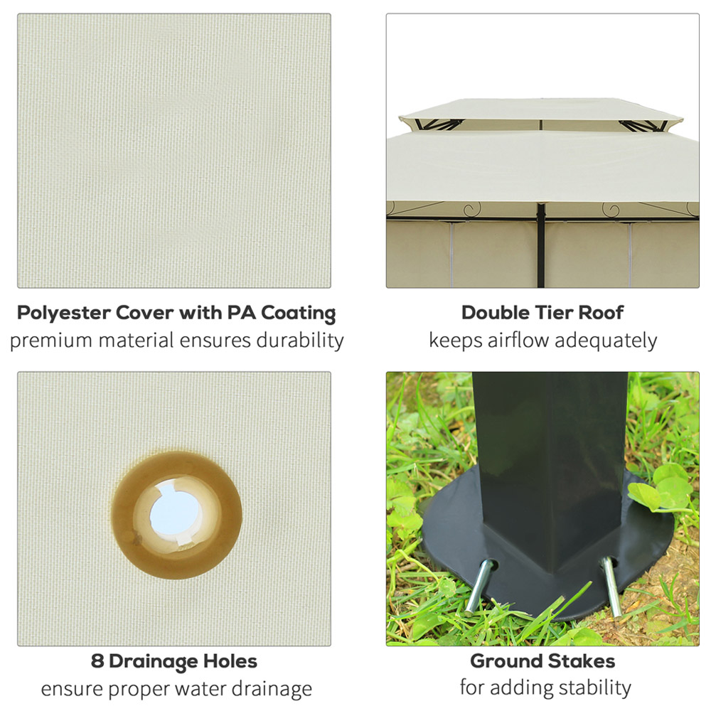 Create the perfect setting for outdoor gatherings with this 4 x 3m beige steel gazebo. Engineered with a robust steel structure and ground stakes, this gazebo stands firm, offering a dependable haven for your garden. Its powder-coated, rust-resistant frame ensures lasting durability, ready to grace your outdoor space for seasons to come. The thoughtfully designed two-tiered roof encourages airflow, providing a comfortable environment while shielding you from rain and wind. Furthermore, the UV-resistant polyester curtains offer essential protection and the option of added privacy whenever desired. Elevate your outdoor entertaining with this permanent gazebo, a stylish and practical addition to any garden. Size: 4 x 3m.