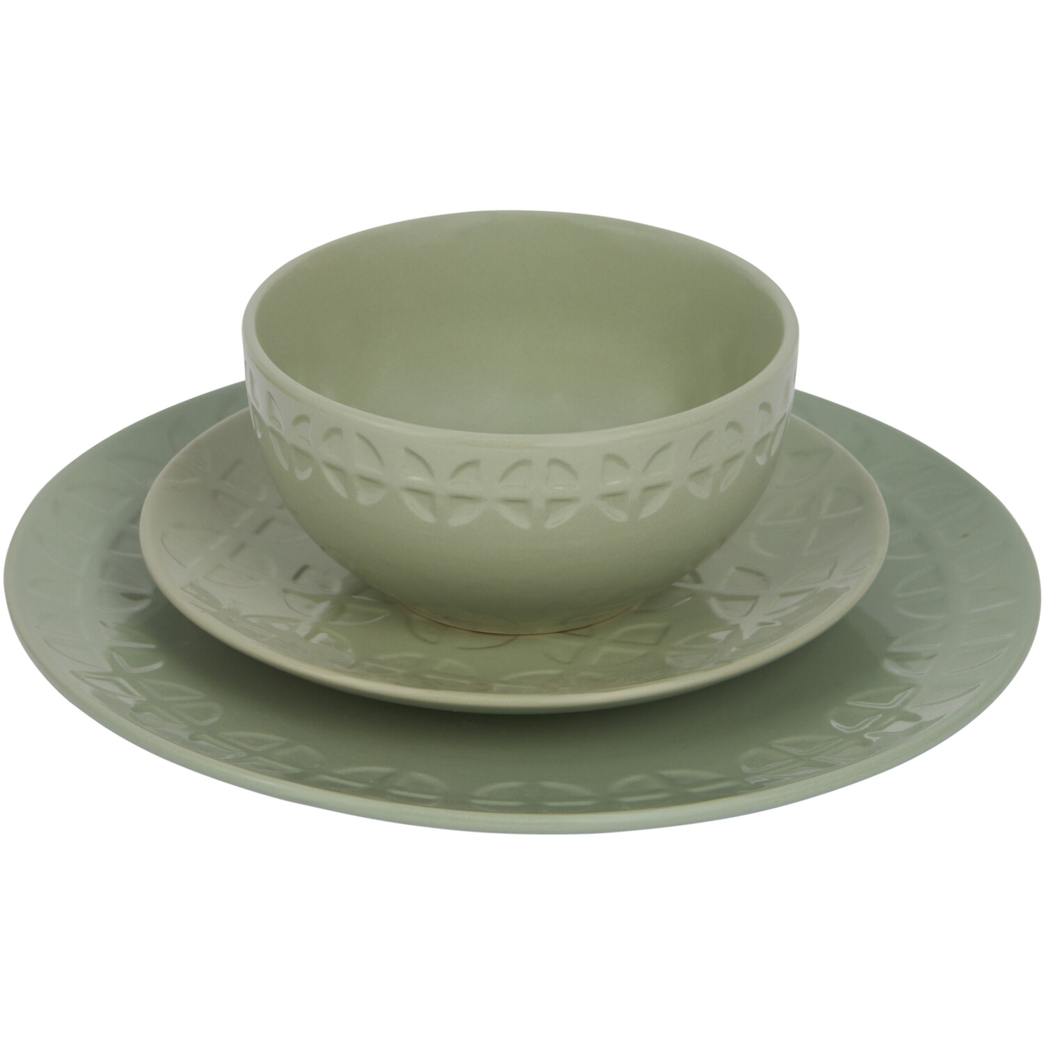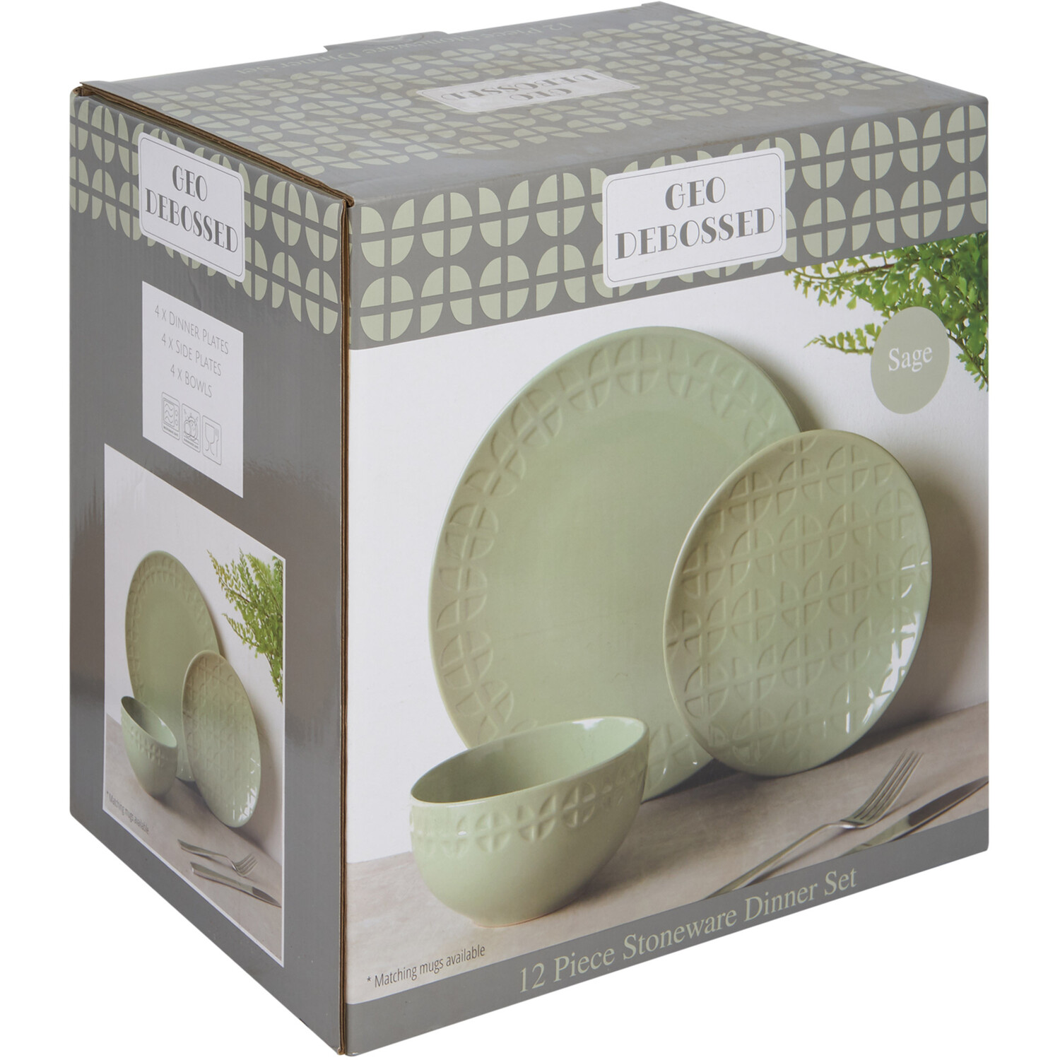 12-Piece Geo Debossed Dinner Set. Four coupe dinner plates, side plates, and rice bowls. Perfect for everyday use and special occasions. Features a debossed abstract pattern reminiscent of 60s/70s retro design. Dishwasher and microwave safe.