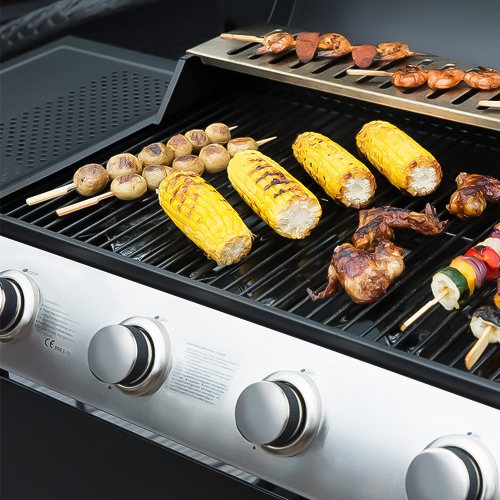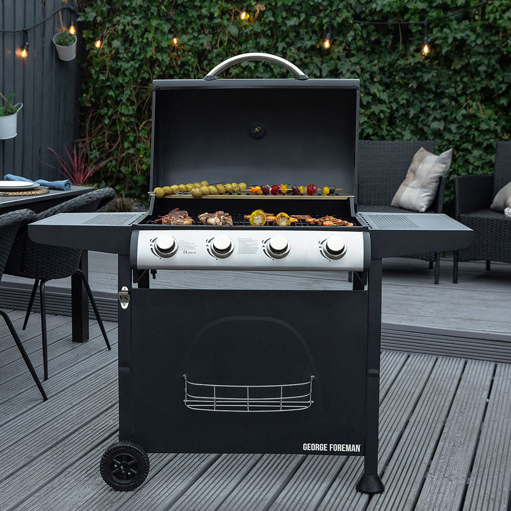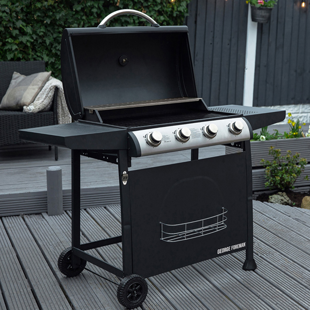 The George Foreman Black 4 Burner Gas BBQ is perfect for creating proper BBQ feasts. An ideal choice for summer evenings or camping trips with friends and family, this four-burner propane gas BBQ delivers a classic outdoor cooking experience. It features automatic ignition and a built-in thermostat, ensuring the temperature is just right when you're cooking. This BBQ can cook up to ten portions at once and has a hinged lid to help cook your food to perfection. A handy side shelf with a condiment rack and bottle opener add to the convenience.