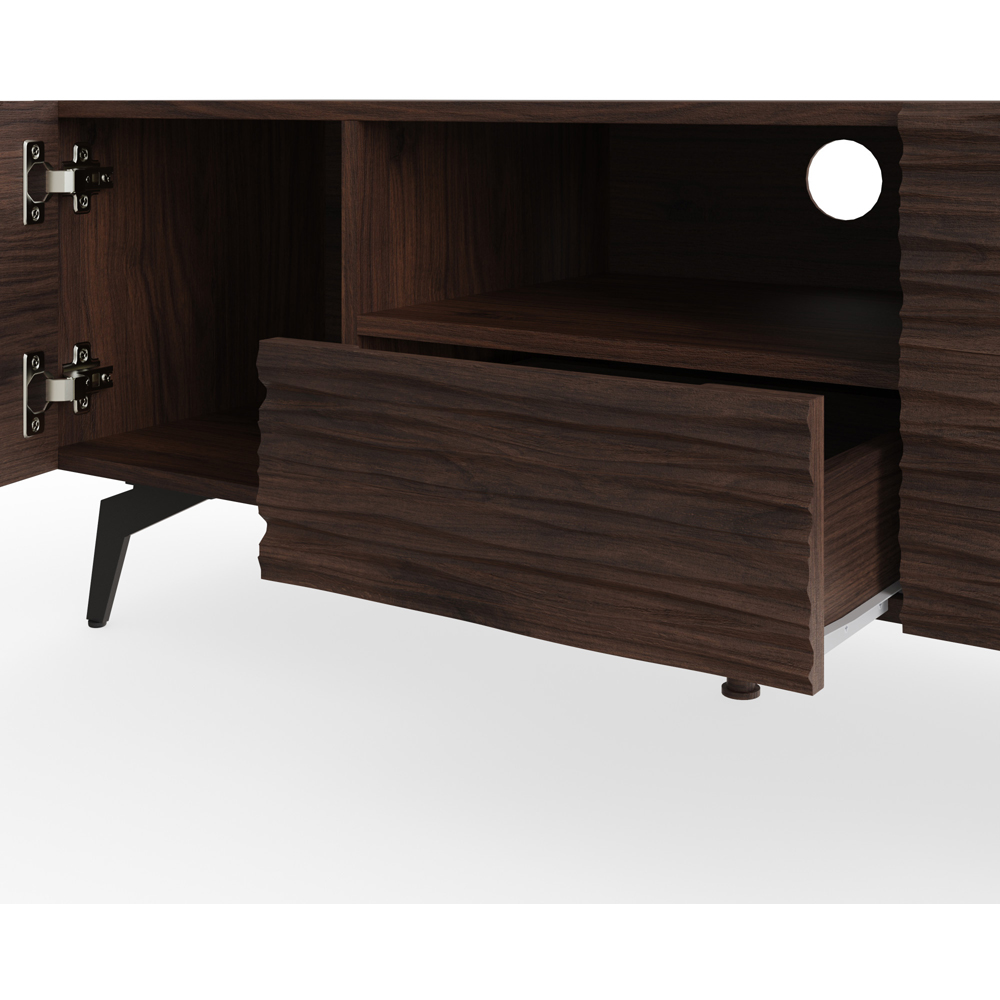 Upgrade your entertainment space with GFW Bantham 2 Door Single Drawer Single Shelf Dark Walnut TV Unit. With its dark walnut finish and wave-textured front, it gives elegant yet modern touch to any space. Central open shelf is perfect for media devices, keeping everything within easy reach. Soft-close hinges make opening and closing smooth and quiet, while generous storage space helps keep clutter out of sight.