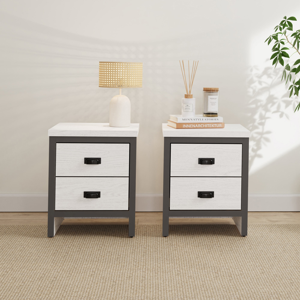 Give your bedroom fresh new look with GFW Boston 2 Drawer White Oak Bedside Table Set of 2. Its industrial-inspired design gives modern vibe that fits right into any contemporary or vintage space. With reclaimed-effect finish, it has that effortlessly urban feel. This bedside table is as practical as it is stylish, featuring two spacious drawers to keep your essentials tucked away and top surface clutter-free. It includes drawer support for extra load weight and solid 30mm thick top panels for sturdy finish.