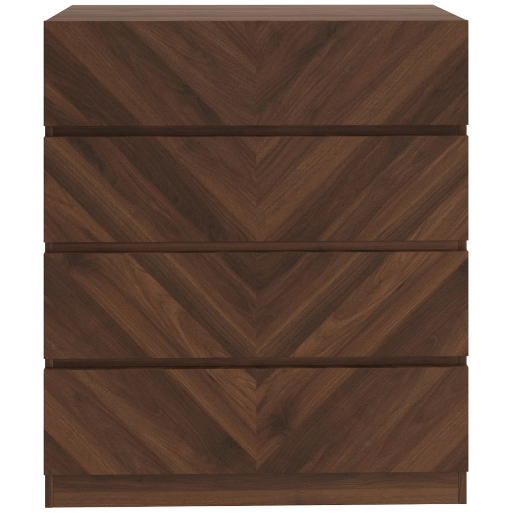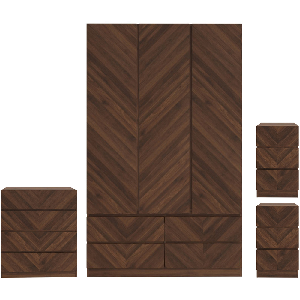 The Catania Royal Walnut Bedroom Set is the perfect finishing touch for your bedroom. This four-piece set includes a sleek three-door wardrobe, a spacious four-drawer chest, and two convenient three-drawer bedside tables. The sophisticated herringbone oak woodgrain effect adds a touch of elegance. Simple styling and generous proportions make a statement. Dimensions: Wardrobe (H x W x D): 195 x 119.5 x 51.5cm, Chest: 89 x 77 x 39.5cm, Bedside Table: 60.5 x 35 x 40cm.