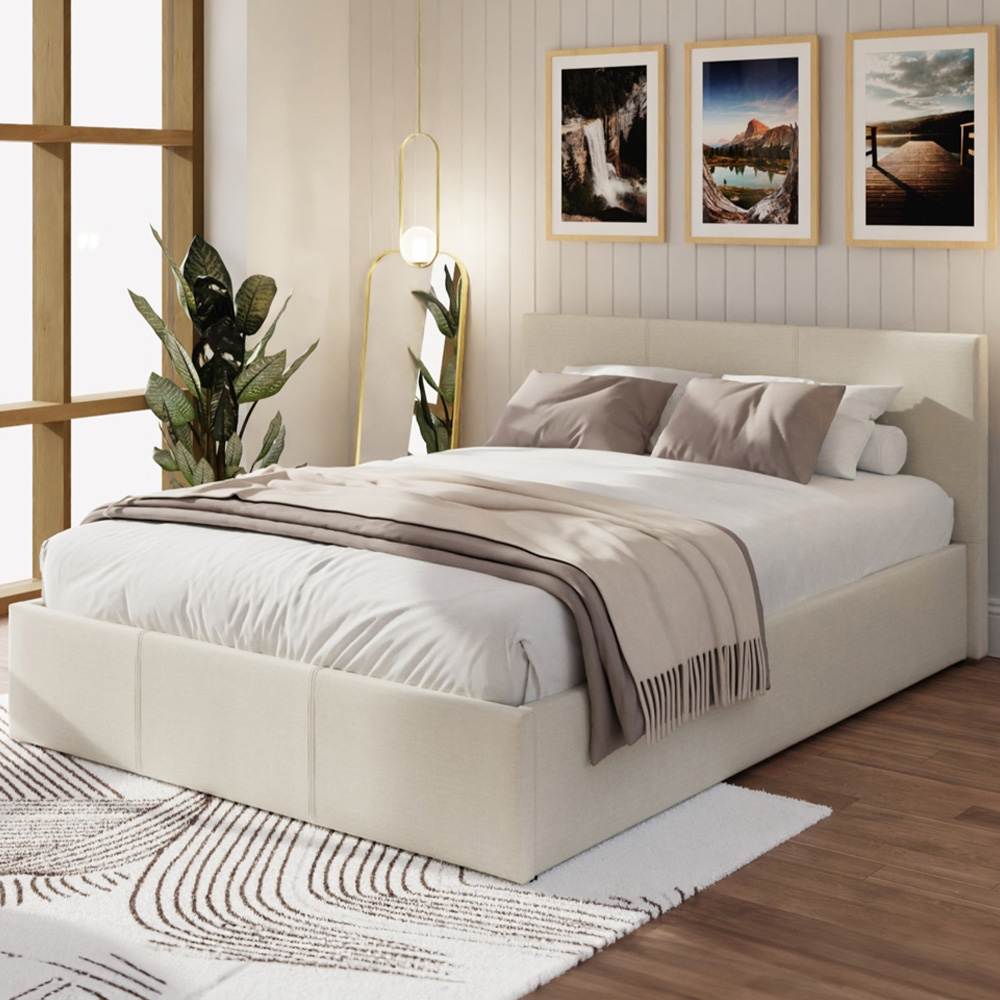 Enhance your bedroom's style and comfort with the GFW Double Natural Ottoman Bed. Crafted with durable hopsack fabric for a cosy feel, this bed boasts a subtle stitched pattern and an elegant headboard and footboard design. The slatted mattress base, reinforced by a strong centre support beam, ensures superior comfort and stability. Enjoy effortless access to the generous concealed storage space via the smooth gas lift hydraulic mechanism. This ottoman bed offers both practicality and sophisticated style.
