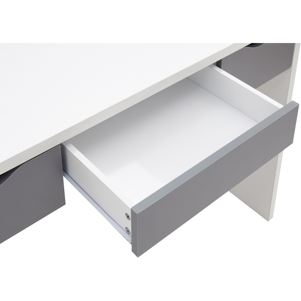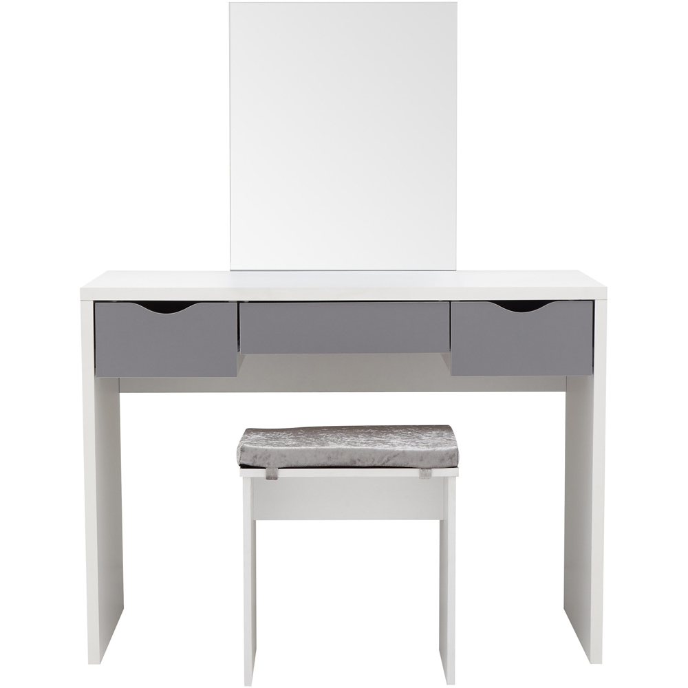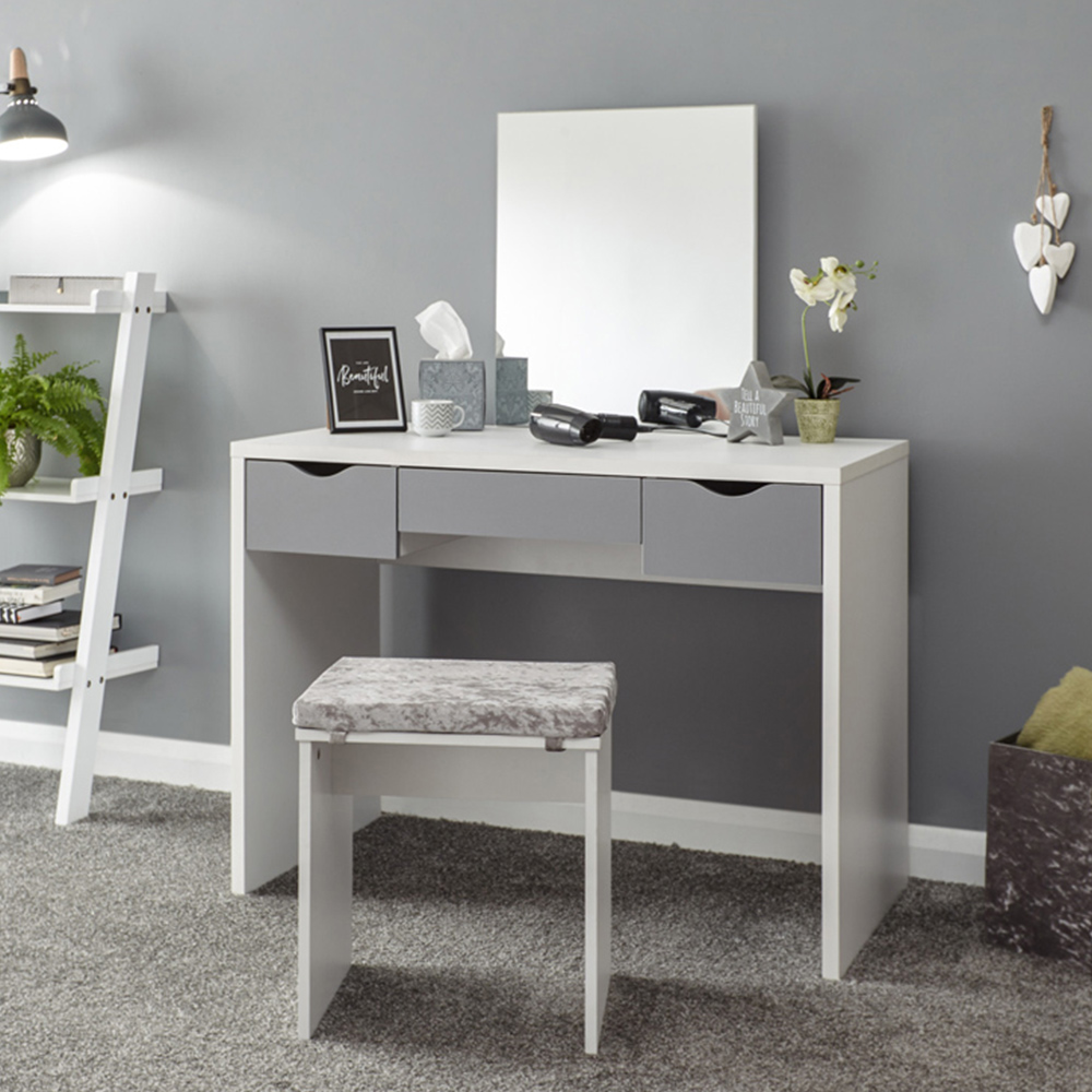 A space-saving dressing table set with a contemporary design. This console-style table features a painted finish and three drawers with contrasting cut-out handles. The tabletop offers ample space for ornaments and decorative accessories, and a fixed frameless mirror is integrated into the design. The matching stool includes a removable padded cushion in a plush cover and conveniently slides under the table for storage. Dimensions: 49.5 x 100 x 129.5cm.