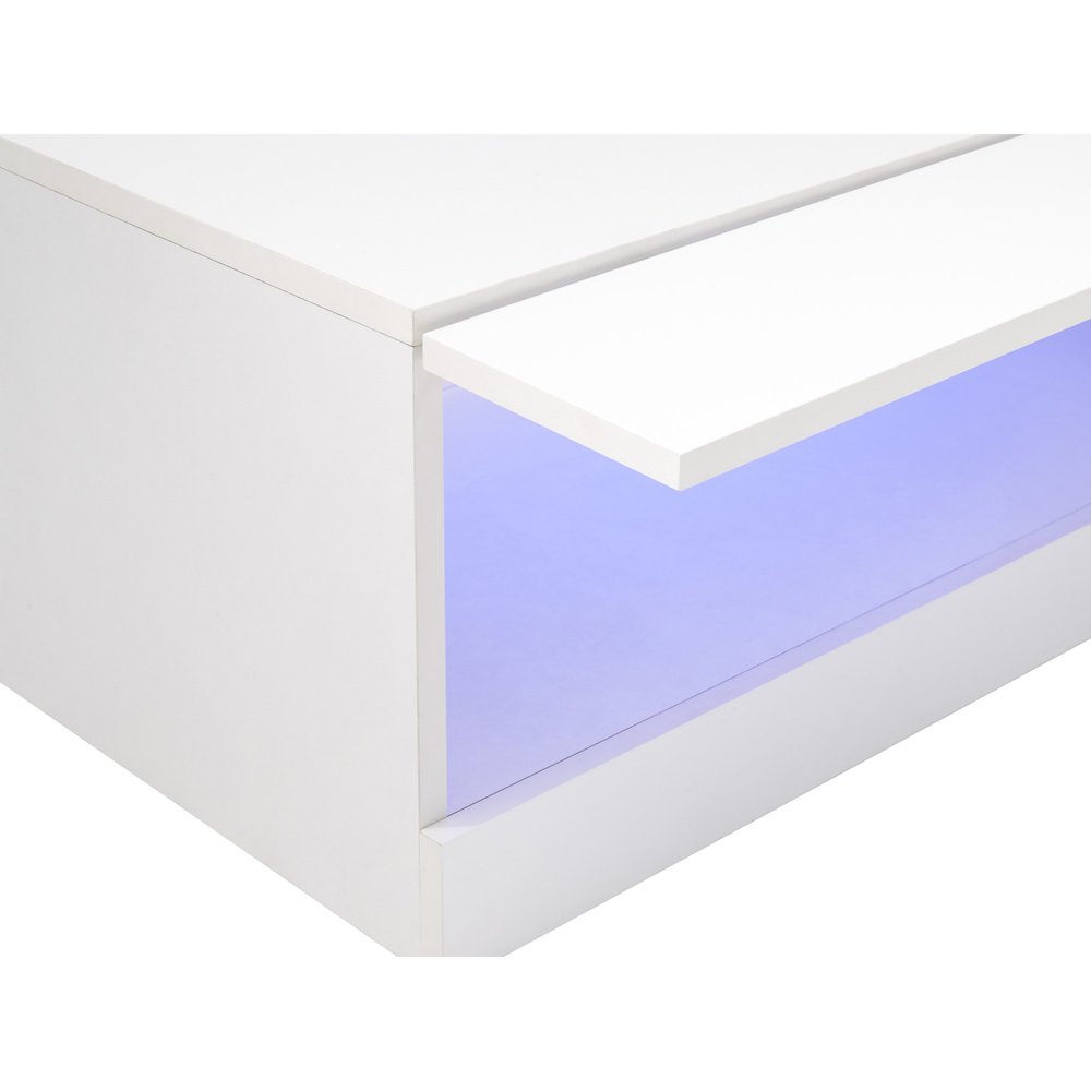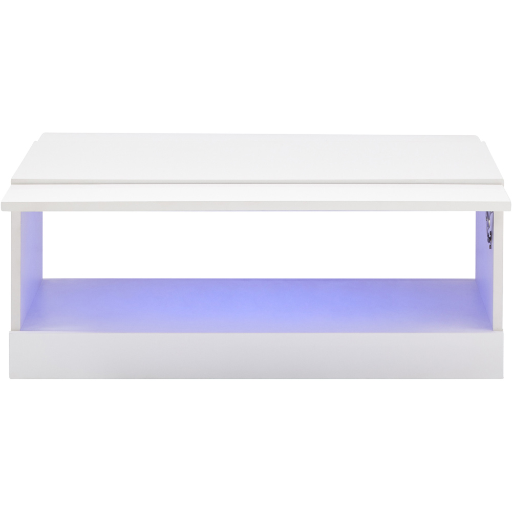 Complete your living room with the Galicia White Coffee Table. Its minimalist cuboid design offers understated elegance. Clever lift-up panels on both sides reveal ample storage, cleverly illuminated by a battery-powered LED downlight. A subtle cut-out detail adds a contemporary flourish. Dimensions: 38 x 75 x 30cm.