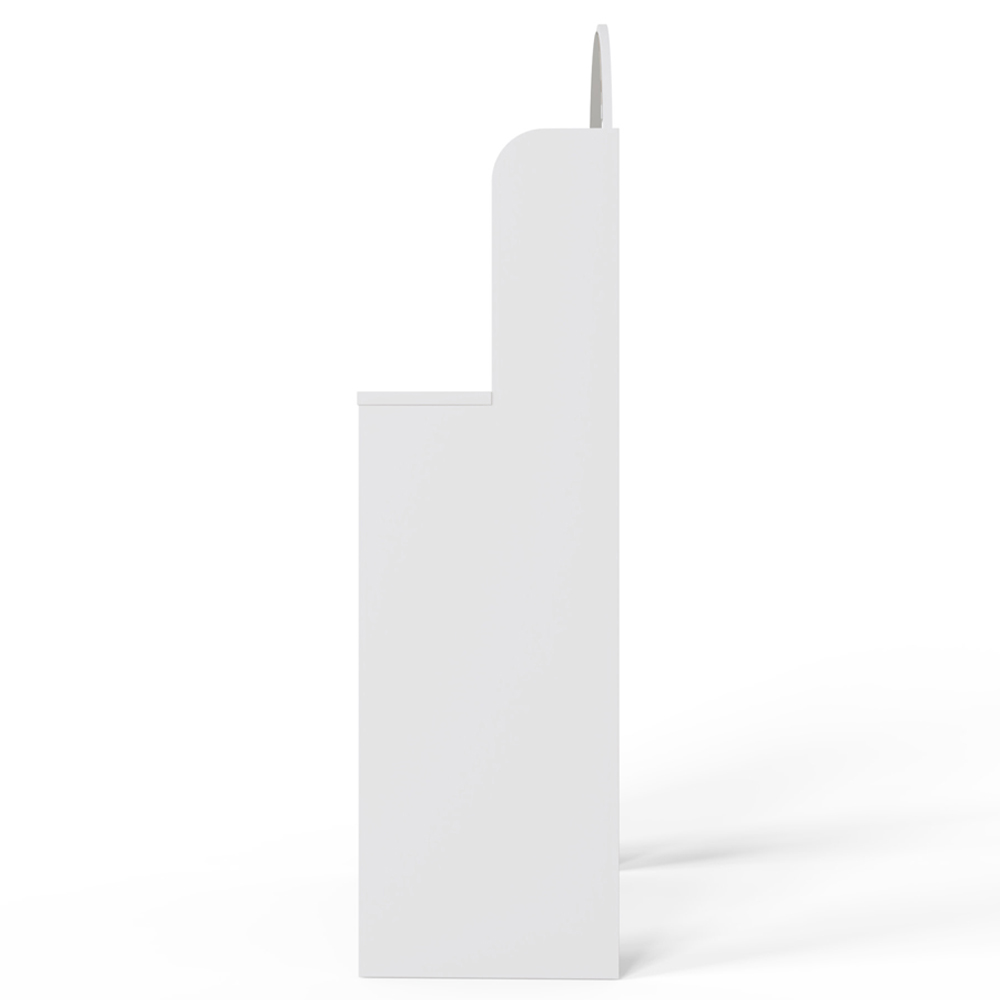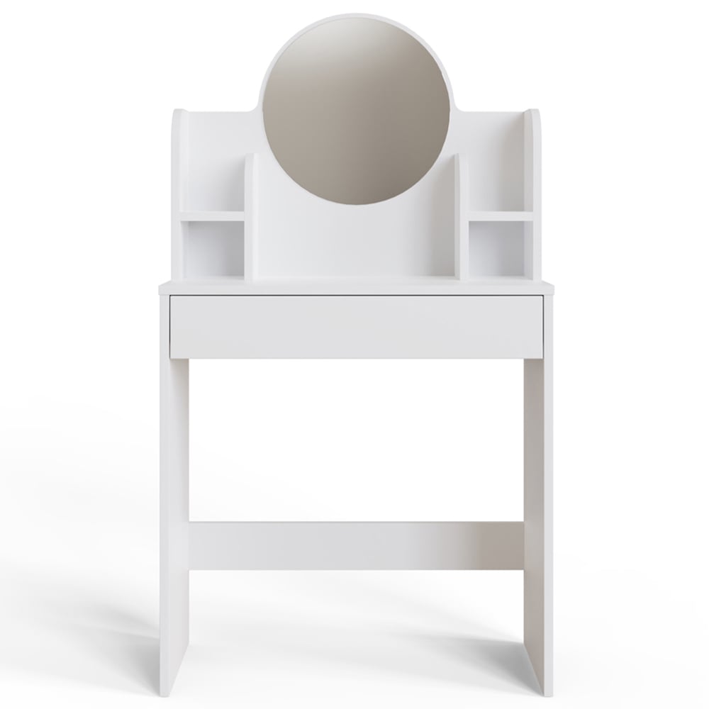 Transform your daily routine with GFW Idis Single Drawer White Dressing Table with Mirror. This elegant piece features one large round mirror that gives you full view for flawless makeup application or hairstyling. With multiple shelves, this dressing table provides ample space for your beauty essentials, keeping everything organised and within easy reach. It includes one spacious drawer that offer even more storage, perfect for stashing brushes, skincare products, or accessories.