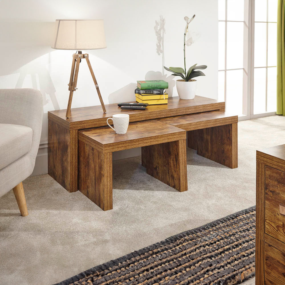 Stylish and space-saving, the GFW Jakarta Mango Long John Nested Tables are perfect for smaller homes. This updated take on a classic design features three nesting tables: two smaller side tables nest neatly beneath a longer display table, providing versatile options for any occasion. The tables showcase a rich hardwood-effect grain, adding timeless elegance to your living space. Dimensions: 39 x 120 x 42cm.