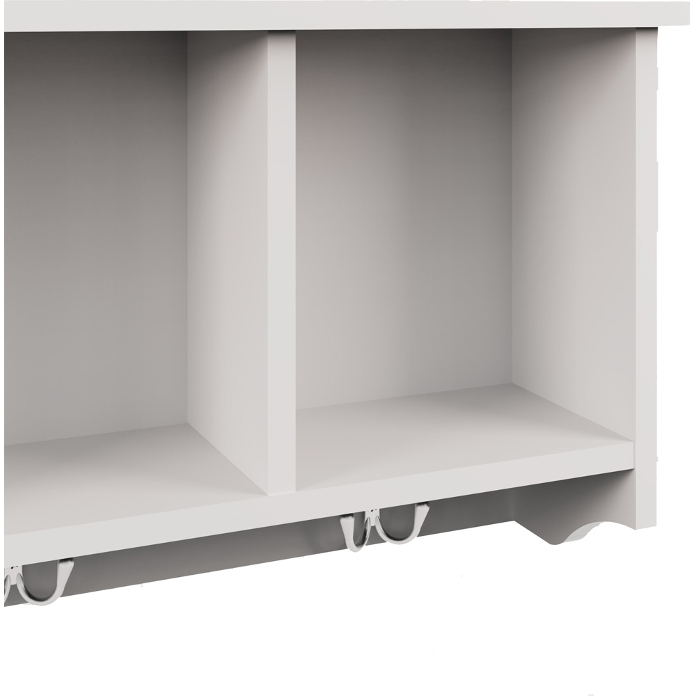 maximise your hallway storage with the Kempton White Wall Mounted Storage Shelves. This unit features four spacious compartments and added hanging hooks, providing a practical and stylish storage solution. Dimensions: 34 x 92 x 17cm.