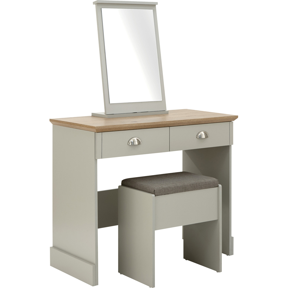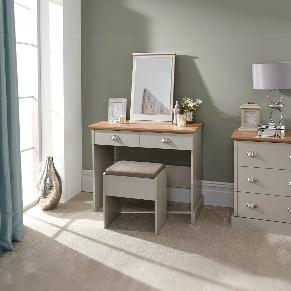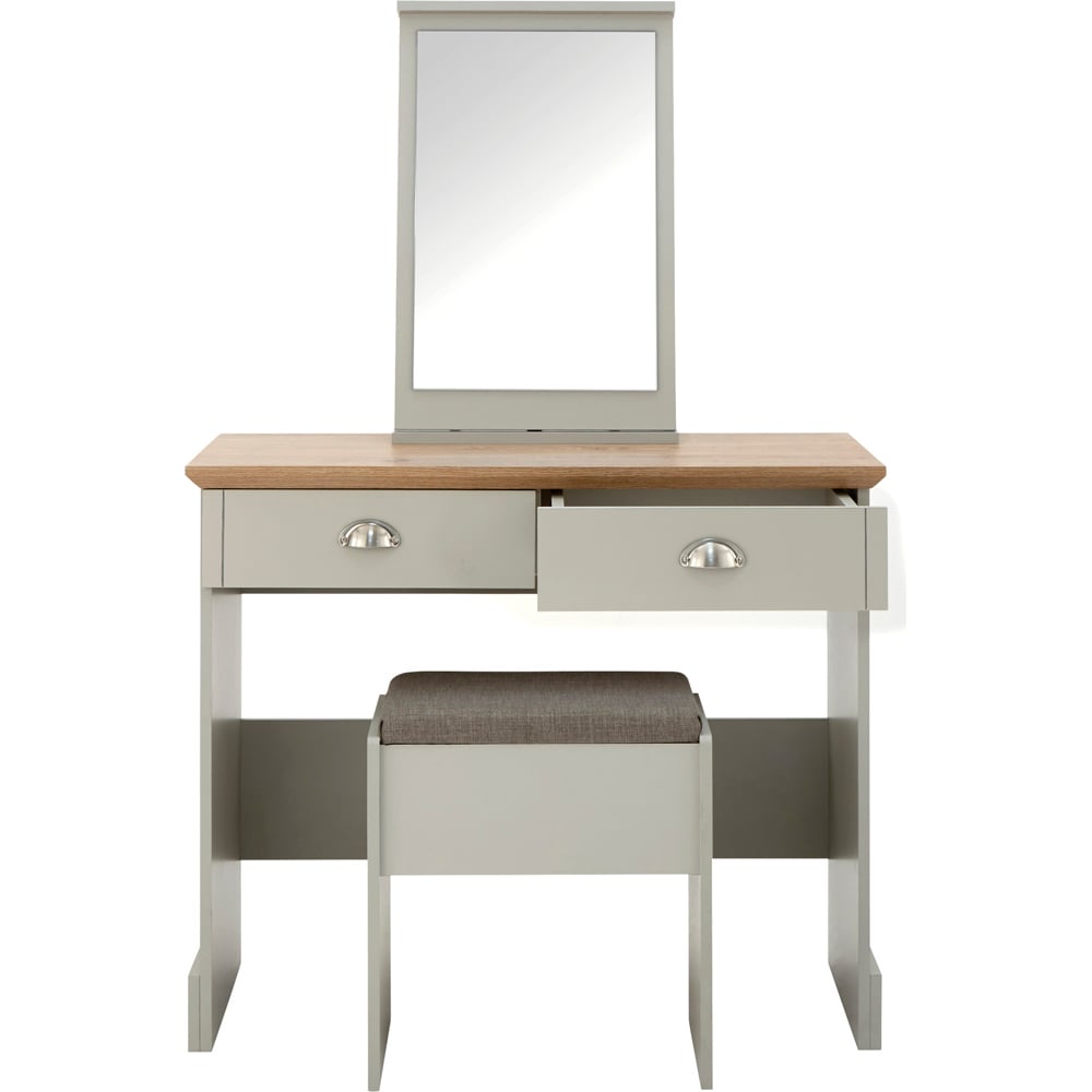 Upgrade your bedroom with the GFW Kendal Grey Dressing Table, a stylish and practical piece that combines beauty and functionality. Its console-style design features integrated drawers and a chic oak-effect top, providing ample storage for your beauty essentials. The matching mirror and soft grey upholstered stool complete the set, with the stool conveniently tucking away when not in use. Dimensions: 45 x 90 x 137cm.