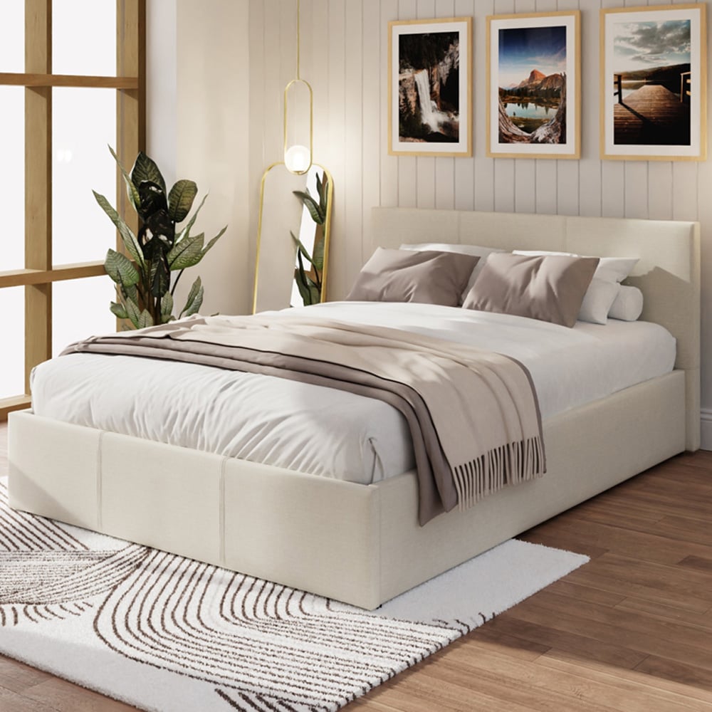 Indulge in comfort and style with the GFW King Size Natural Ottoman Bed. This king-size bed frame offers hidden storage, effortlessly accessed via a gas lift hydraulic mechanism. Crafted with durable hopsack fabric for a cosy feel, its subtle stitched pattern and elegantly designed headboard and footboard add a touch of sophistication. The slatted mattress base, reinforced by a strong centre support beam, ensures lasting comfort and stability. A perfect blend of practicality and elegance for any bedroom.
