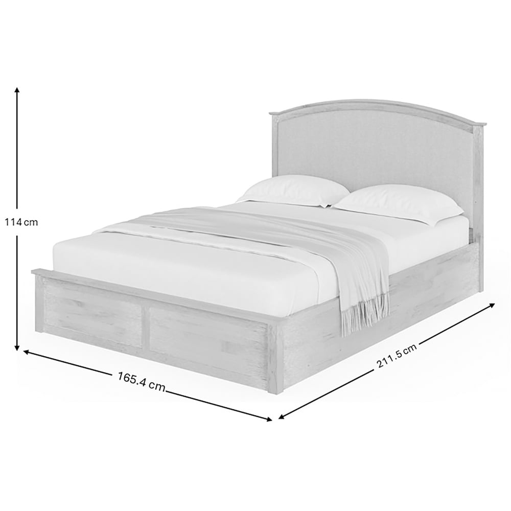 Enhance your bedroom's aesthetic with the Madrid King Size Limed Oak Ottoman Bed. Its country artisan style, achieved through a plank and panel effect, brings rustic charm to any space. Crafted from durable solid oak, this bed boasts a natural limed oak headboard and elegantly designed footboard. A strong centre support beam and sprung slatted mattress base ensure both comfort and stability. The easy lift mechanism provides convenient access to ample under-bed storage, making this piece as practical as it is beautiful.
