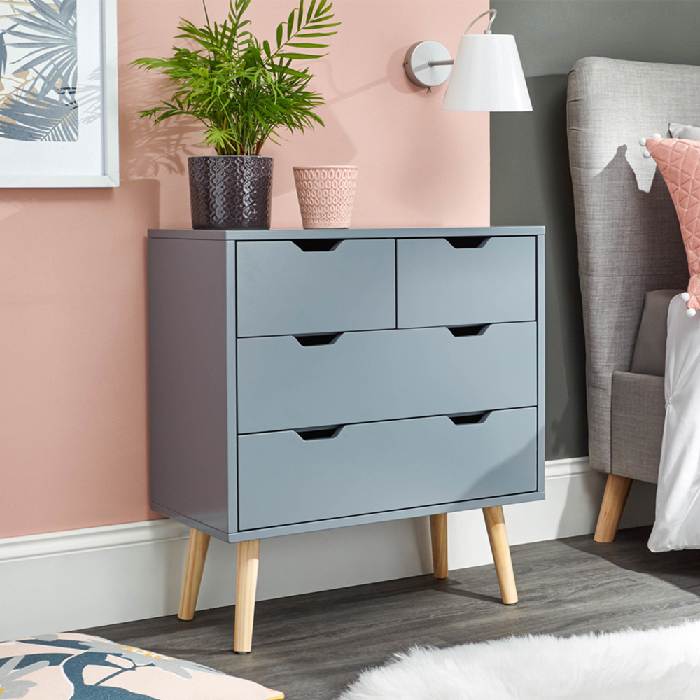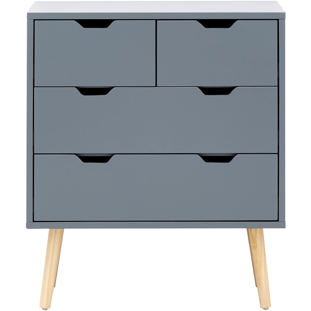 Discover the perfect blend of style and storage with the GFW Nyborg Dark Grey 2 Plus 2 Drawer Storage Chest. Part of a modern Scandinavian design, it's the ideal addition to any contemporary bedroom for the style-conscious. This chest features a simple construction, offering two spacious full-width drawers and two convenient half-width drawers, all accented with neat, cut-out handles. The smooth painted finish is available in a selection of on-trend colours, including this season's warm pink, soft green, and ink blue shades. Supported by slender, mid-century-inspired pale wood legs. Dimensions: 30 x 60 x 69.5cm.