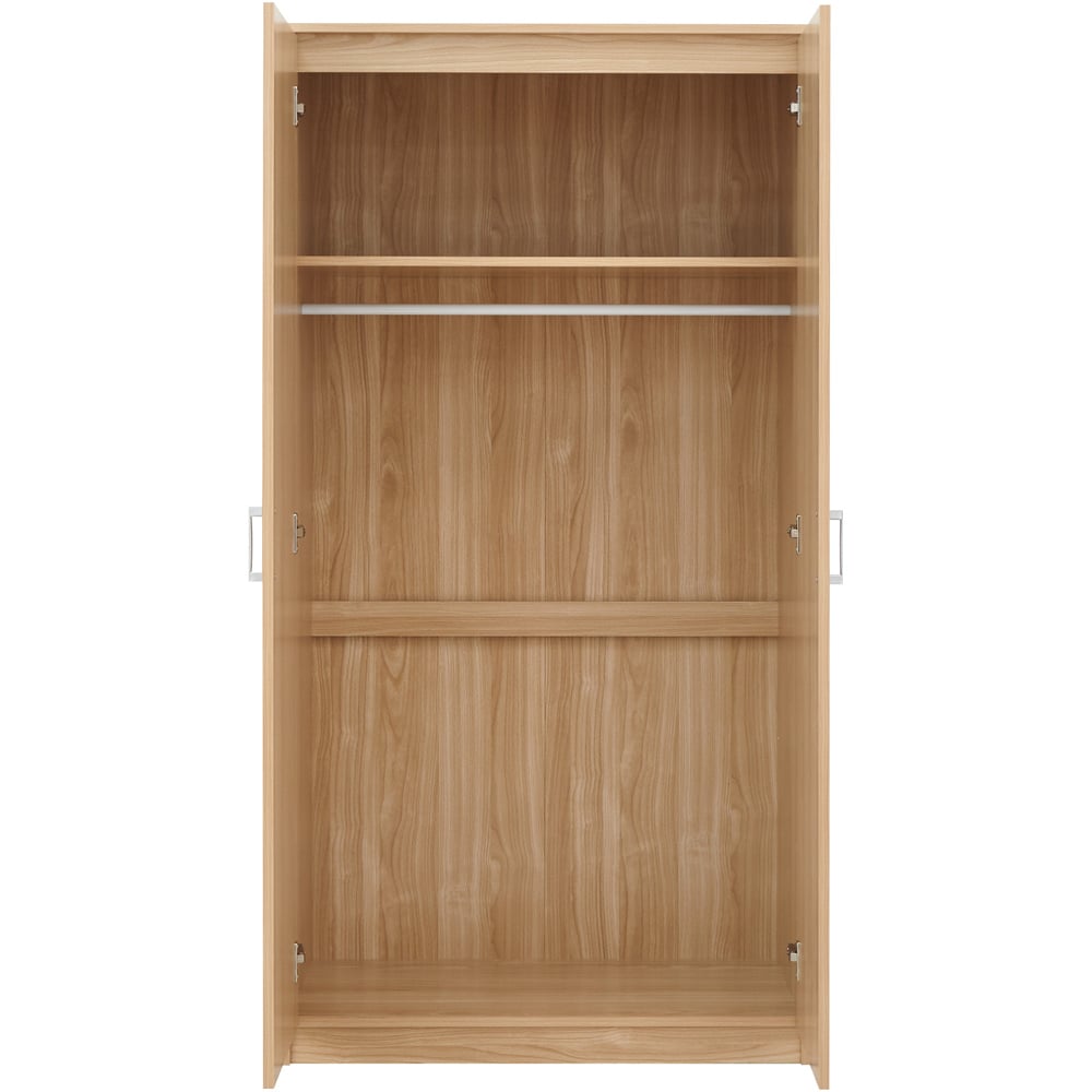 Stylish and practical, the GFW Panama 3-piece oak wood bedroom set is perfect for a contemporary bedroom. Its simple design features clean lines and sleek satin handles. This great-value set includes a two-door wardrobe, a three-drawer chest, and a bedside table with a shelf and drawer, providing ample hanging and flat storage.